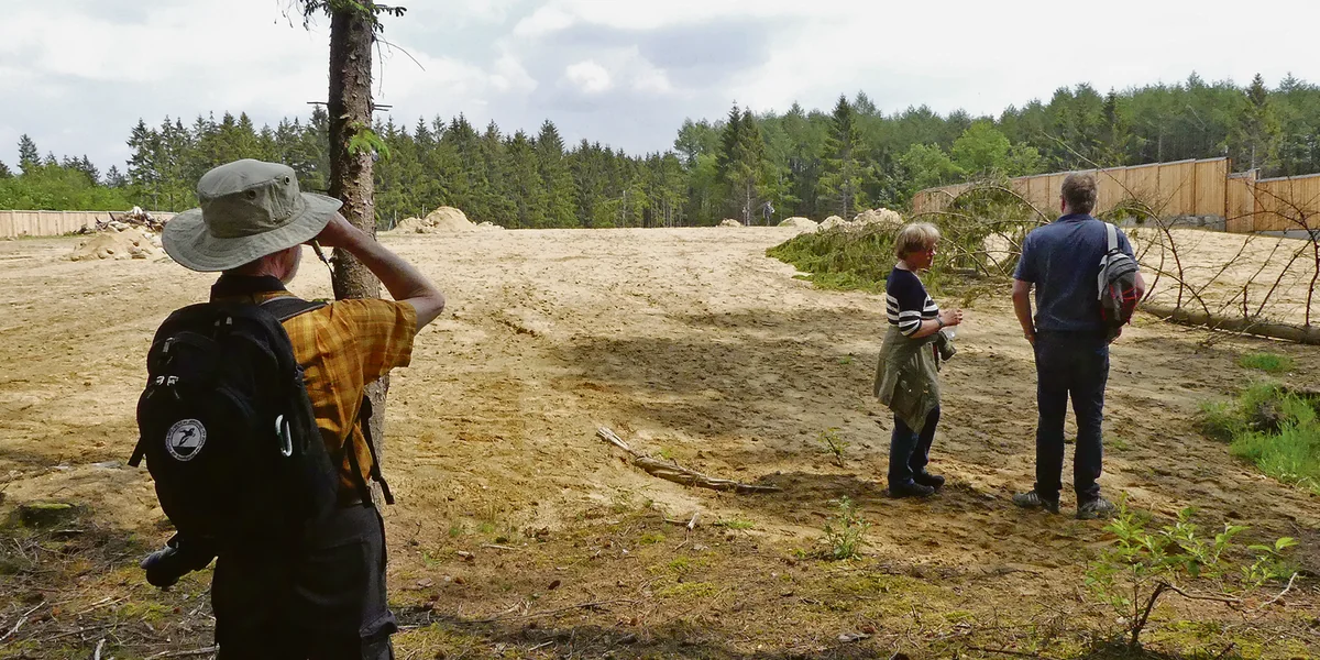 Wolfsbetreuer Springborn stößt wieder zur Gruppe und erzählt aufgeregt von einer Begegnung vor wenigen Minuten. „Damhirsche, acht Stück, die sind hier gerade noch drübergelaufen, ein ganzes Rudel.“ Damit bald möglichst viele Arten die Grünbrücke als ihren Lebensraum annehmen, wurden dort Sträucher und Bäume gepflanzt, Magerrasen ausgesät und Baumstümpfe verteilt. Momentan ist es vor allem sandig. Ihren Zweck erfüllt die Brücke trotzdem schon.