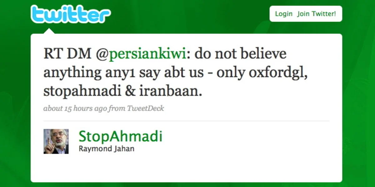 BERLIN taz | Die Nachricht kam Dienstagfrüh von Raymond Jahan, der unter dem Twitter-Namen StopAhmadi schreibt: Er leitete eine persönliche Nachricht (offenbar direkt an ihn) von User persiankiwi weiter. "Glaubt nichts, was irgendeiner über uns sagt – nur oxfordgirl, stopahmadi und iranbaan." Letztere sind die Namen dreier populärer und geachteter Twitterer aus dem Iran, deren Tweets zwischen 8.000 und 15.000 Menschen verfolgen.
