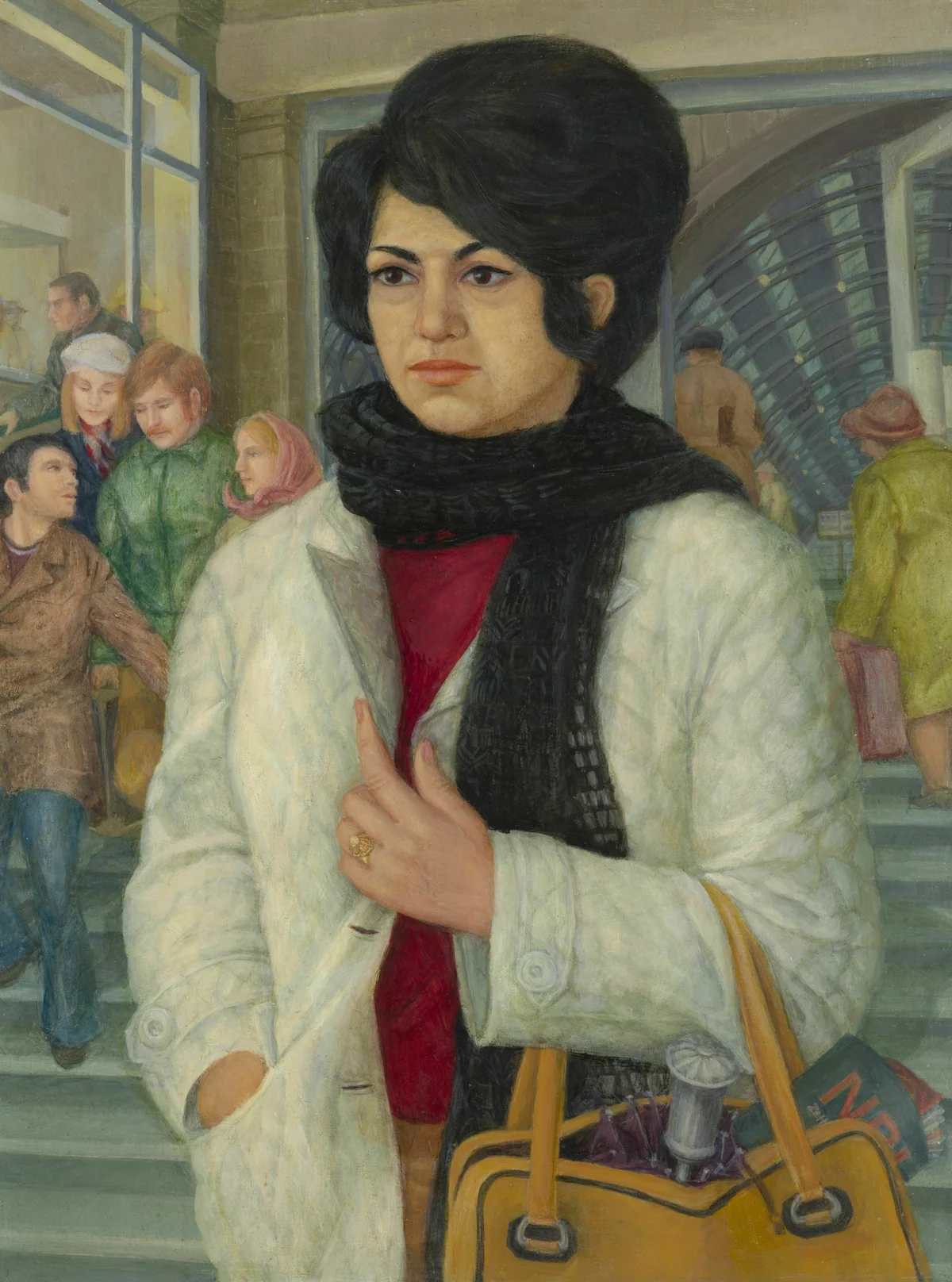 Eine junge Frau steht vor den Stufen im Leipziger Hauptbahnhof, in der Handtasche einen Regenschirm und die NBI, die Neue Berliner Illustrierte. „Die Iranerin M. M.“ ist eines der vielen Bilder in der Ausstellung „Bilderkosmos Leipzig. 1905–2022“ im Museum der bildenden Künste (MdbK), über das man mehr erfahren möchte. 1972 war es auf der 8. Kunstausstellung des Bezirks Leipzig zu sehen und kam zwei Jahre später ins Museum.
