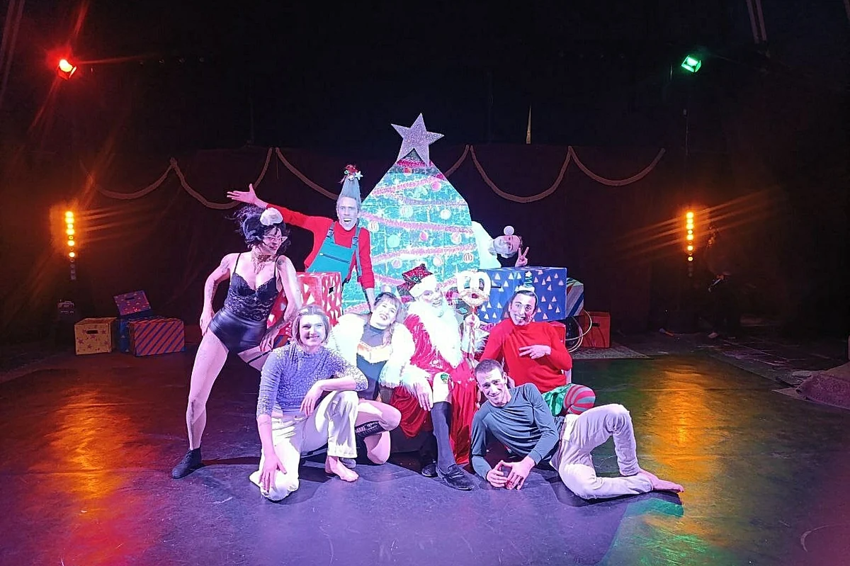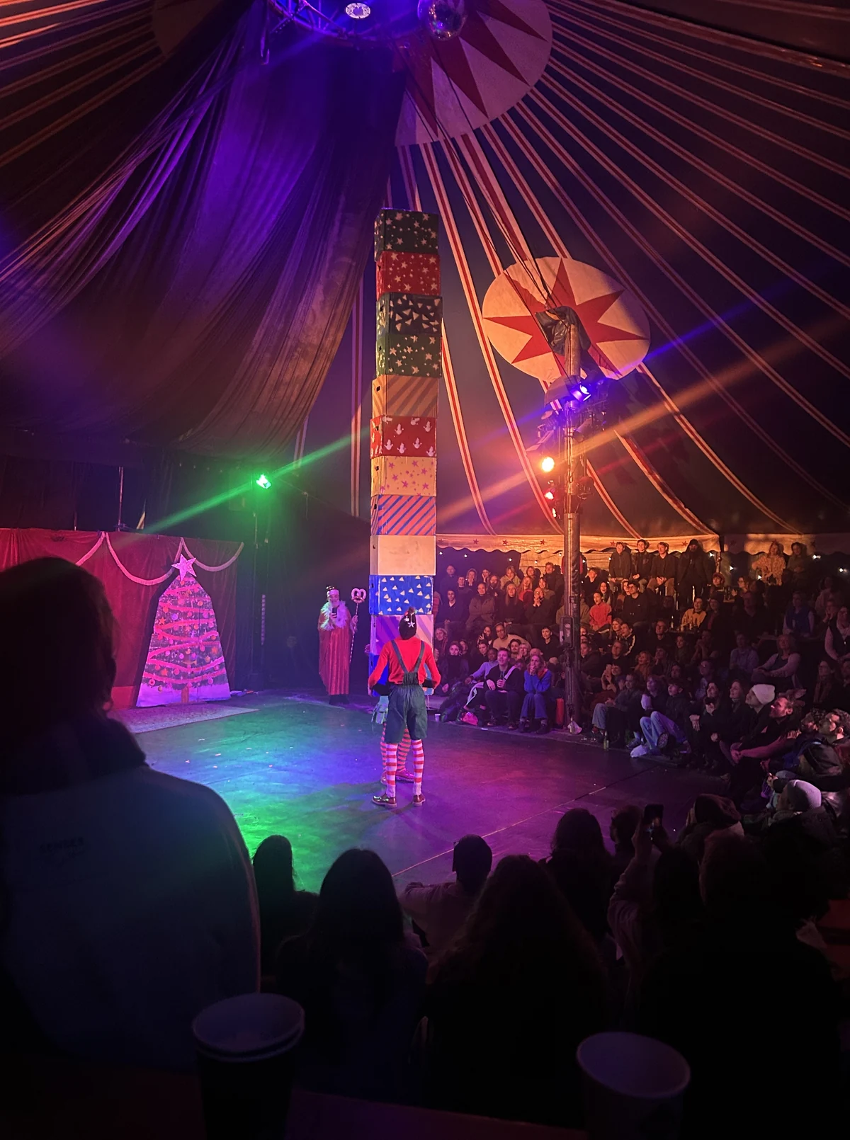 Im Zelt riecht es nach Popcorn und selbst gebackenen Keksen. Auf den Sitzkissen toben die Kinder, als plötzlich das Licht ausgeht und ein tätowierter Weihnachtsmann mit jeder Menge Glitzer auf die Bühne rauscht. Er lässt erst die Kleinen Krach machen, dann die Eltern und zum Schluss „alle Singles, die den ganzen Tag nur trinken“.