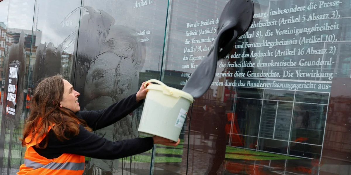 Aktivist:innen der Gruppe Letzte Generation hatten das Denkmal am Samstag beschmiert. Mehrere ihrer Unterstützer hätten die Glasskulptur „Grundgesetz 49“ vor dem Jakob-Kaiser-Haus „in Erdöl getränkt“, teilte die Gruppe mit. Zu der Glasskulptur „Grundgesetz 49“ gehören 19 jeweils rund drei Meter hohe Glasscheiben. Darin sind die 19 Grundrechtsartikel des Grundgesetzes mit Laser eingraviert.