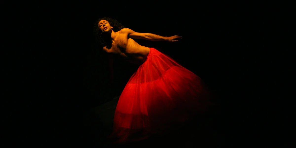 Die Bewegung geht über in schwingende Arme, die Hüfte kreist eindringlicher, ausschweifender. Seine Mimik ändert sich, der Mund leicht geöffnet, lasziver Blick. Seine Ausstrahlung wandelt sich, bekommt etwas Erotisches. Es erinnert an stereotype maskuline und feminine Posen, die sich abwechseln, dann aber zerstört er die Zweiteilung: Sein Gesicht zuckt, dann wieder neigt er es zur Seite. Seine Atmung ist laut zu hören.
