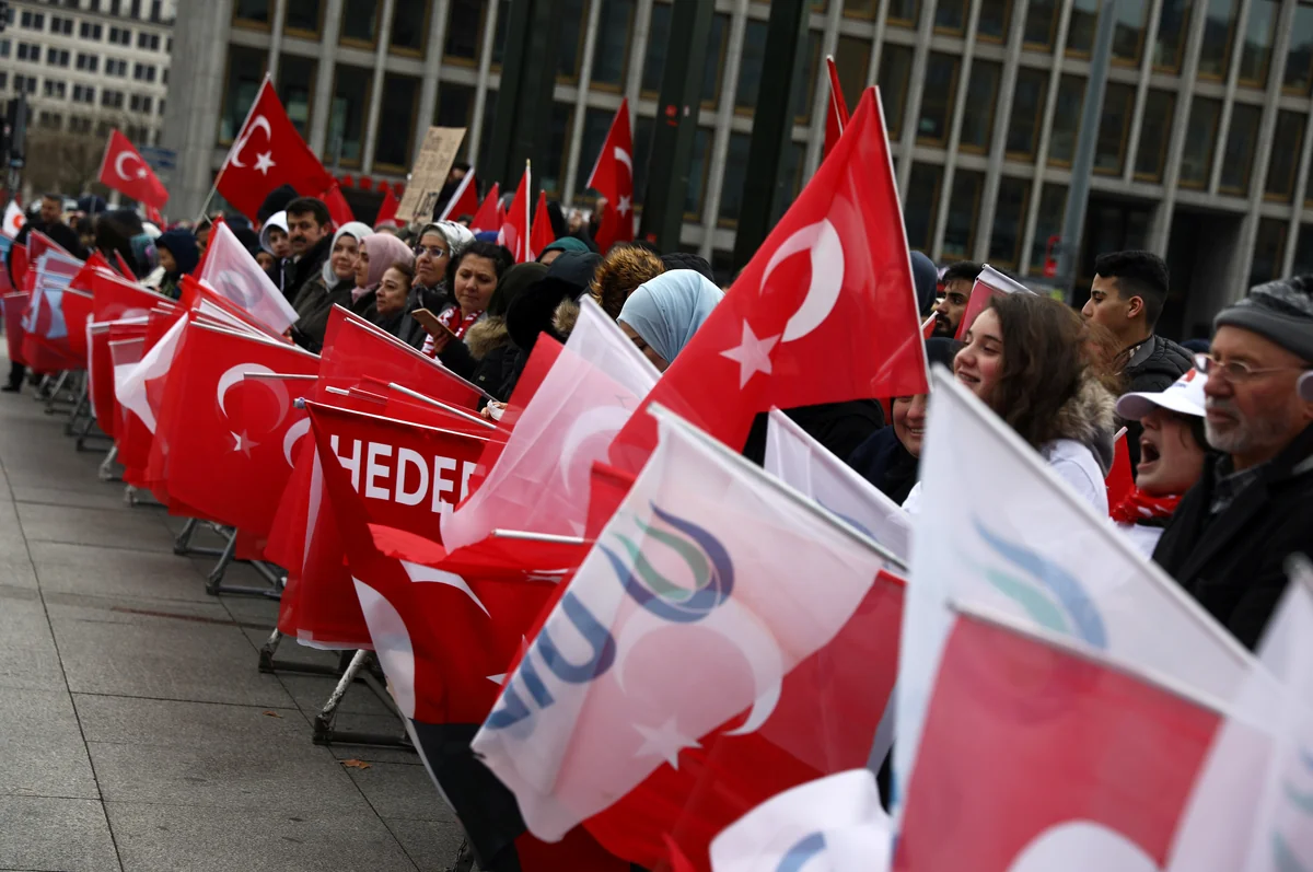 Am Potsdamer Platz haben sich rund 200 Erdoğan-Anhänger versammelt. Sie schwenken die rote türkische Nationalflagge mit weißem Halbmond und Stern. Auffällig viele Frauen, fast alle tragen ein Kopftuch, sind darunter; auch Kinder springen herum. Alle wirken wie im Fieberrausch. Warum sie da sind? „Weil wir Erdoğan lieben“, sagt eine Frau und strahlt. „Wir wollen ihn begrüßen.“