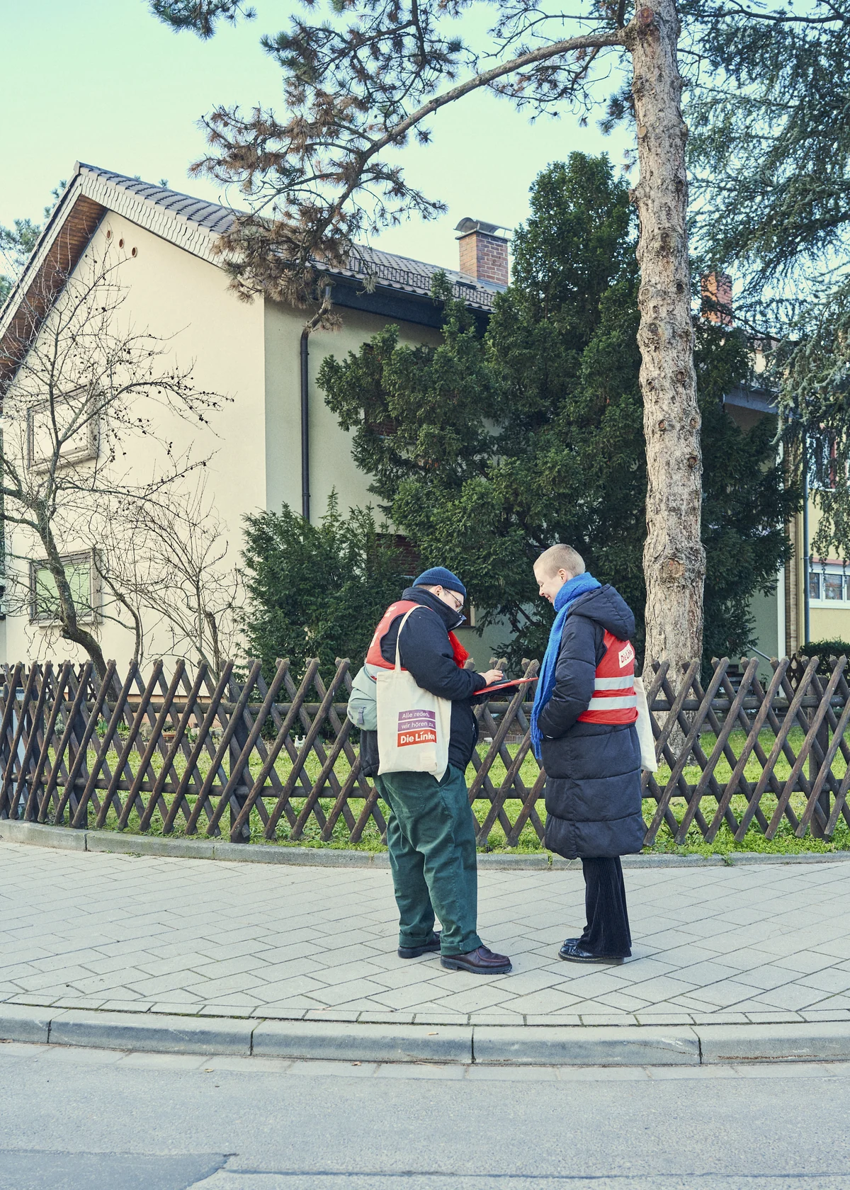 Bohnen ist gelernte Bankkauffrau, bei der Volksbank saß sie am Schalter und verhält sich auch beim Wahlkampf so. Wenn sie an einer Haustür klingelt, nickt sie und lächelt, diskutiert nicht, bedankt sich, wenn ihr Menschen von ihren Sorgen erzählen. „Revolutionäre Freundlichkeit“ nennt das Bohnen und zitiert damit Ines Schwerdtner, die Co-Vorsitzende der Linkspartei. Bohnen fordert nicht auf, stattdessen bietet sie Hilfe an: Die Menschen können die Mietwucher-App und den Heizkostencheck nutzen, auf kleinen Flyern ist der zugehörige QR-Code gedruckt. Dort prüft die Linke dann, ob man zu hohe Mieten oder Nebenkosten zahlt.