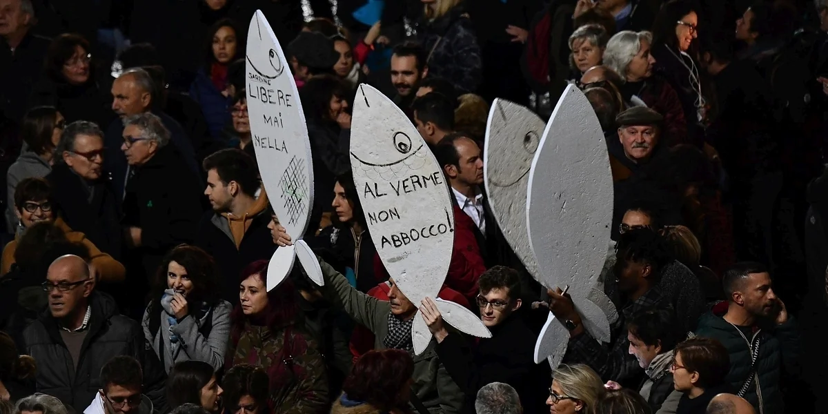 Es kommen über 10.000. Sie halten selbstgebastelte bunte Fische in die Luft. Darunter auch Elly Schlein, damals gerade im Wahlkampf für eine progressive linke Bewegung, heute die frisch gewählte Vorsitzende der Partito Democratico. In den folgenden Monaten breitet sich die Sardinenbewegung im ganzen Land aus, in zig Städten finden friedliche Demonstrationen statt.