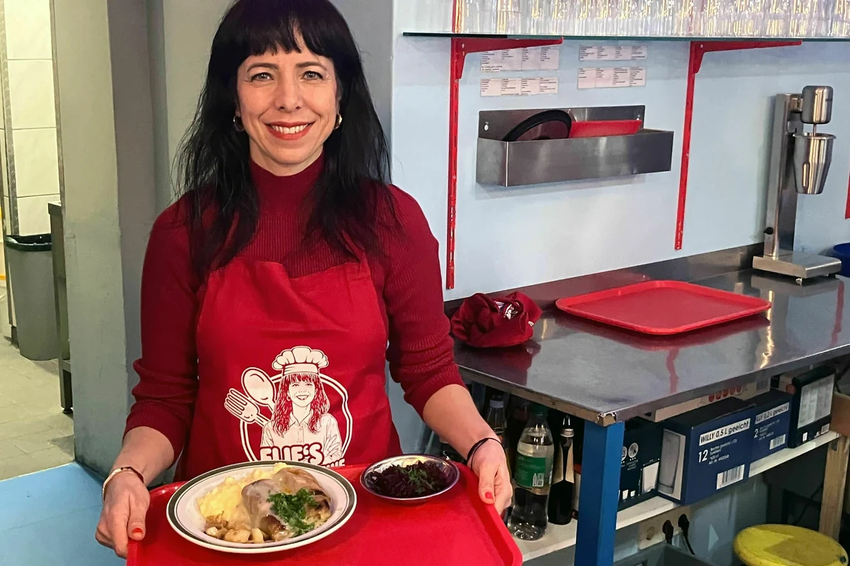 Die Bürgermeisterkandidatin der Linken präsentiert sich den Kameras in Kochschürze mit der Aufschrift „Elif's Kiezkantine“. „Alles muss man selber machen“, scherzt Eralp, während sie den anwesenden Reporter:innen Kohlrouladen mit Kartoffelpüree auftischt.