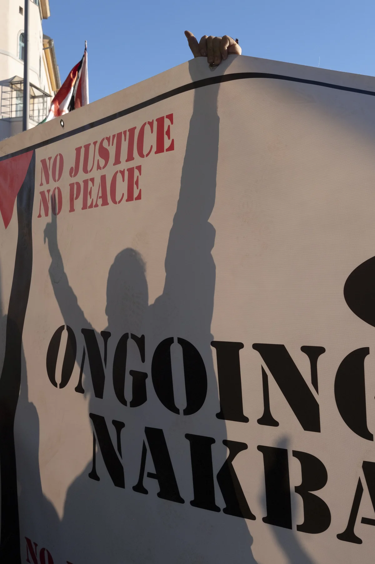 Jamal erzählt, dass die Gruppe seit zwei Jahren zu Solidaritätsbesuchen nach Palästina reist und befreundete Aktivist:innen von dort nach Berlin einlädt. Der jüngste Besuch war nach dem 7. Oktober. Im Netz hat die Gruppe Bilder gepostet, wie sie mit ihren palästinensischen Gästen vor dem Sowjetischen Ehrenmal in Berlin-Treptow posiert. In der Bildunterschrift ist die Rede von „palästinensischen und jüdischen Geschwistern, die nicht still sein wollen“. Bei ihren Gästen hätte die Sorge um das eigene Leben und das der Angehörigen und Freunde dominiert, erzählt Jamal. Die Demoverbote seien als „ungerecht und erniedrigend“ empfunden worden. „Bei der Verabschiedung am Flughafen haben die palästinensischen Genossen gesagt: Fünfzig-fünfzig, dass wir uns je wiedersehen. Das ist das Gefühl gerade.“