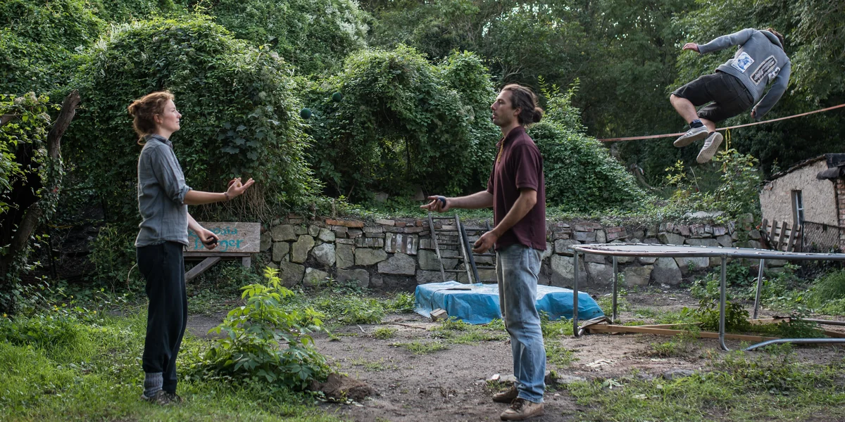 Zurück in der Hasi: Ein Trampelpfad führt vorbei an den gemeinschaftlichen Hochbeeten mit Tomaten und Kürbissen, deren Pflanzenblätter wie große Teddybär-Ohren übereinanderhängen. Das Grundstück ist 3.000 Quadratmeter groß, und alles ist irgendwie auf eine perfekte Art zusammengewürfelt: Pastellfarbene Wohnwagen und VW-Busse, ein efeubewachsenes Rondell, das als Theaterbühne dient, ein quietschendes Trampolin, eine Bank, die von einem Ast baumelt.