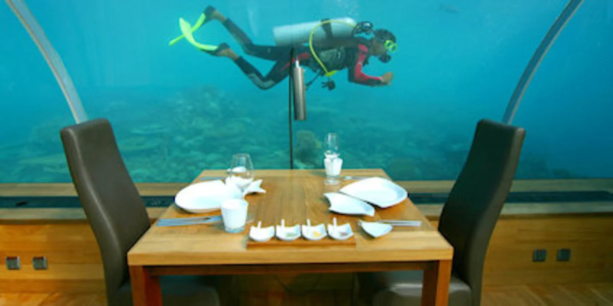 Verglastes Unterwasserrestaurant: Auf der Welt einmaliges Dining-Erlebnis auf dem Meeresgrund. Eine transparente Acrylröhre erlaubt eine Rundum-Sicht auf vorbei- und sogar über die Gäste hinwegziehende Fischschwärme, die hier der Tiefe wegen zahlreicher und vielfältiger ausfallen, als man es beispielsweise vom Schnorcheln her kennt. Platz für 12 Personen. Formelle Kleidung erwünscht. 5-Gänge-Menü westlich-maledivischer "Fusions-Küche": 120,00 Euro