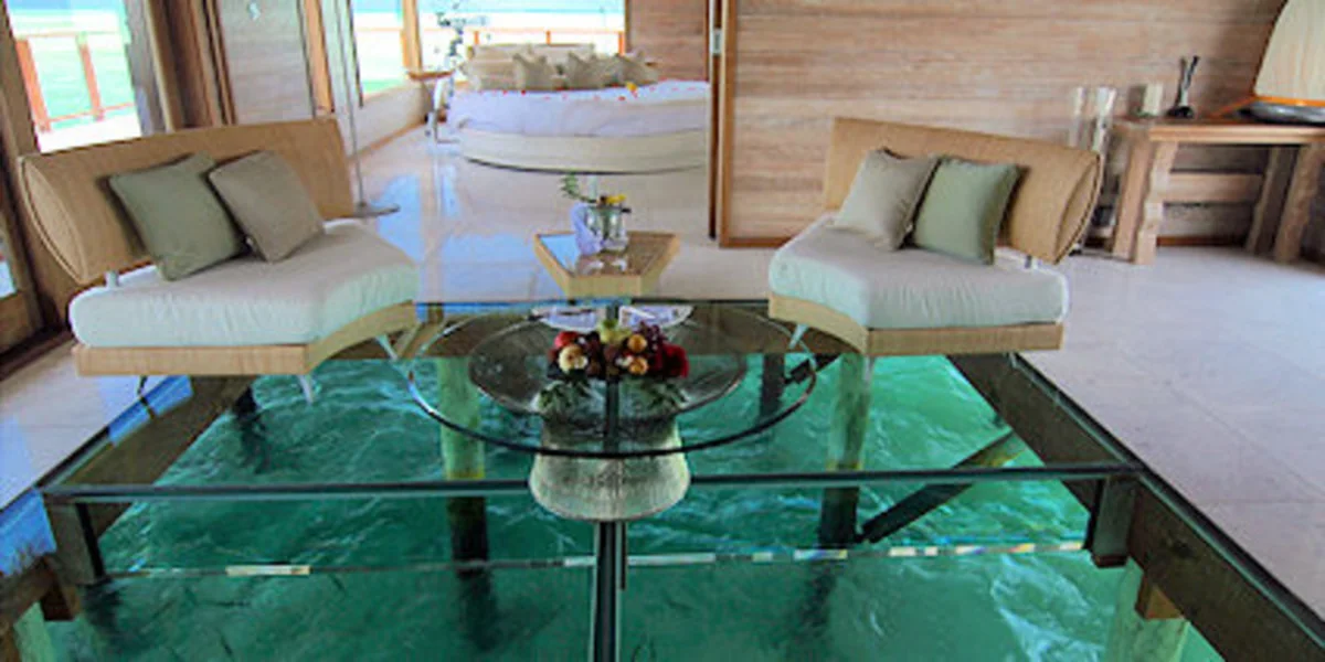 "Villa" ist hier eine durchaus passende Bezeichnung, allein die Größe unseres Domizils ist beeindruckend. Rund 200 Quadratmeter bieten alles, was das Herz begehrt - und noch viel mehr. Glastüren und enorme Fensterfronten aufs leuchtendblaue Meer, alles wirkt offen und luftig-leicht. Gleich beim Eintreten schimmert uns der riesige Glasboden entgegen. Dies dürfte der größte seiner Art überhaupt sein. Darauf scheinen die Sessel über dem Wasser zu schweben. Und unten tummeln sich die Fische. Wir sind versucht, gleich die Sessel zu entfernen und uns zur großen Unterwasser-Show auf die zehn Quadratmeter große Fläche zu begeben, ganz ohne nass zu werden. Doch wir haben gar keine Zeit, uns den langnasigen Trompetenfischen gebührend zu widmen, denn schon entdecken wir in der Villa ein Highlight nach dem andern.