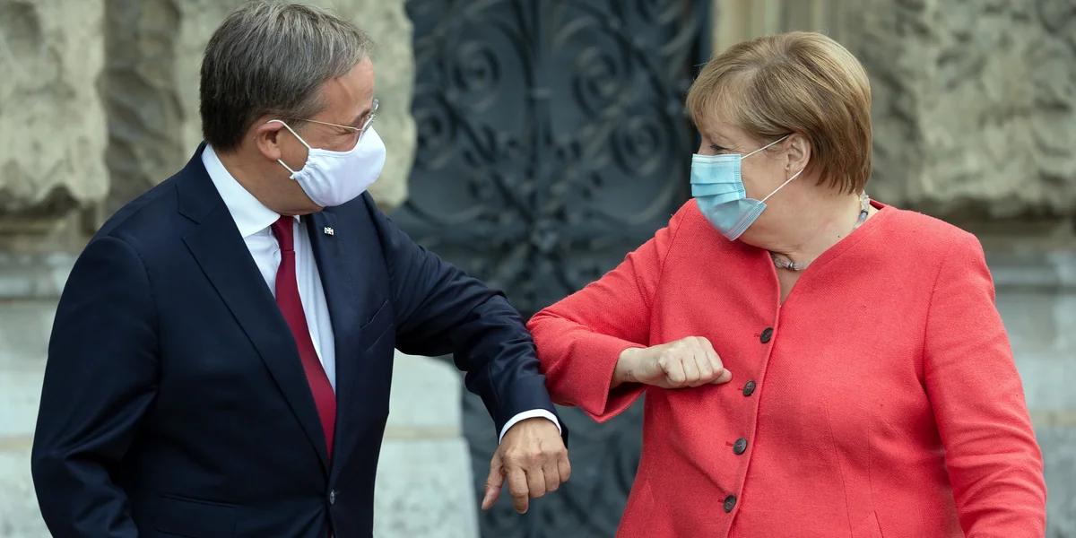 Völlig anders also die Szenerie bei Laschet am Dienstagnachmittag. Im altehrwürdigen Ständehaus in Düsseldorf, wo einst der NRW-Landtag tagte, fand gerade die Kabinettssitzung der schwarz-gelben Landesregierung statt, Merkel nahm daran teil. Nun steht die Kanzlerin im pinkfarbenen Blazer neben Laschet, und berichtet über das Treffen. Die Pandemie habe auch hier im Mittelpunkt gestanden, sagt sie.