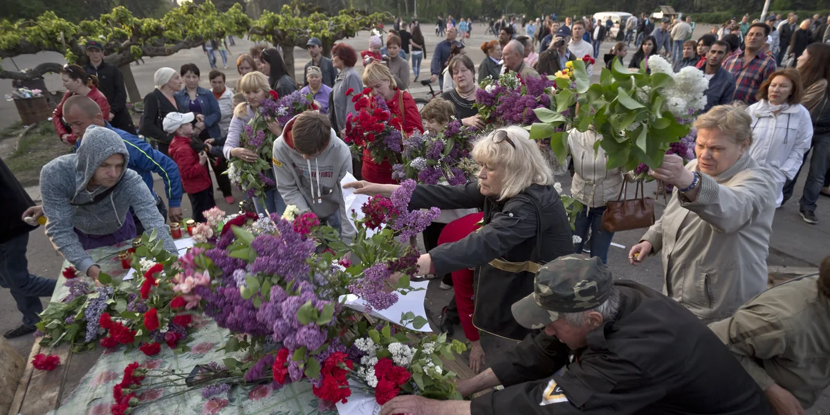 Einen Tag später, am 9. Mai, treffen sich an derselben Stelle mehrere Tausend Menschen, die in russischer Sprache der sowjetischen Gefallenen gedenken. Viele tragen am Revers das in der Ukraine verbotene St.-Georgs-Bändchen, das in Russland obligatorisch ist. Eine Kapelle spielt sowjetische Märsche und Sprechchöre skandierten „Gegen die Faschisten!“ – natürlich auch gegen die in Kiew. Plötzlich taucht Gouverneur Micheil Saakaschwili auf, bahnt sich einen Weg durch die Menge und legte Blumen für die Toten des Krieges ab.