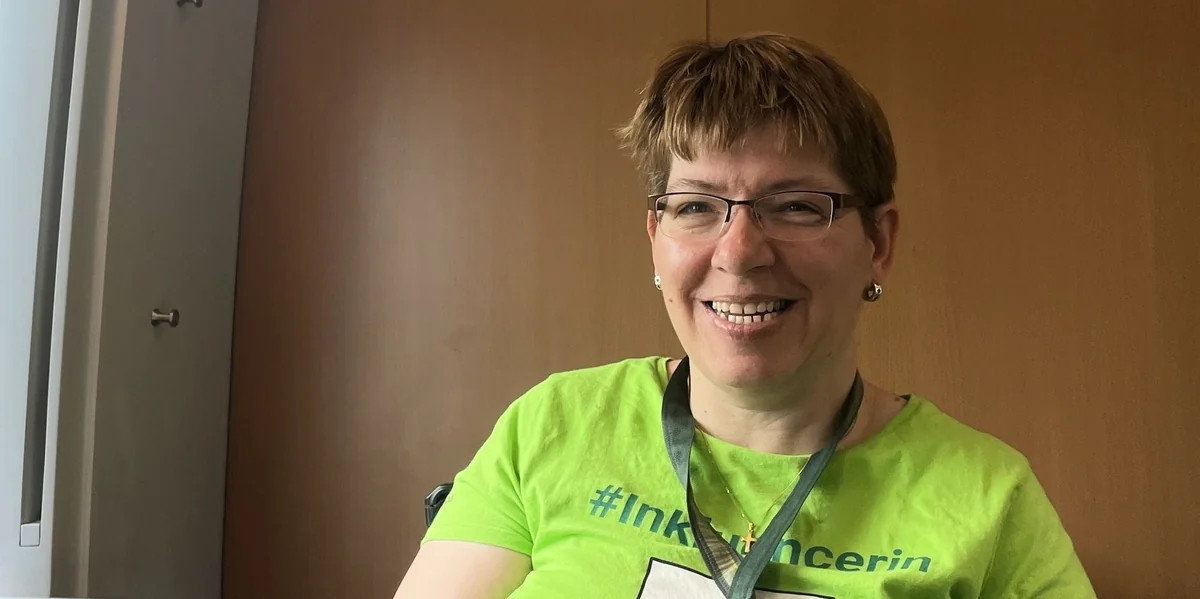 Evi Gerhard ist 48 Jahre alt und sitzt im Rollstuhl. Sie trägt ein knallgrünes T-Shirt, auf dem der Schriftzug „#Inkluencerin“ und ein selbst designtes Logo zu sehen ist. Es besteht aus dem Piktogramm einer Rollstuhlfahrerin, deren Körper den Buchstaben A bildet. Im Reifen befinden sich viele bunte Punkte, die für Inklusion stehen. Ein horizontaler Strich unter dem Reifen symbolisiert Barrierefreiheit. „Aktiv mit Rolli“ ist die Botschaft. Auf ihrem gleichnamigen Instagram-Account nimmt Evi Gerhard regelmäßig Menschen mit in ihren Alltag. Dieses Mal begleite ich sie als ihre Assistentin.