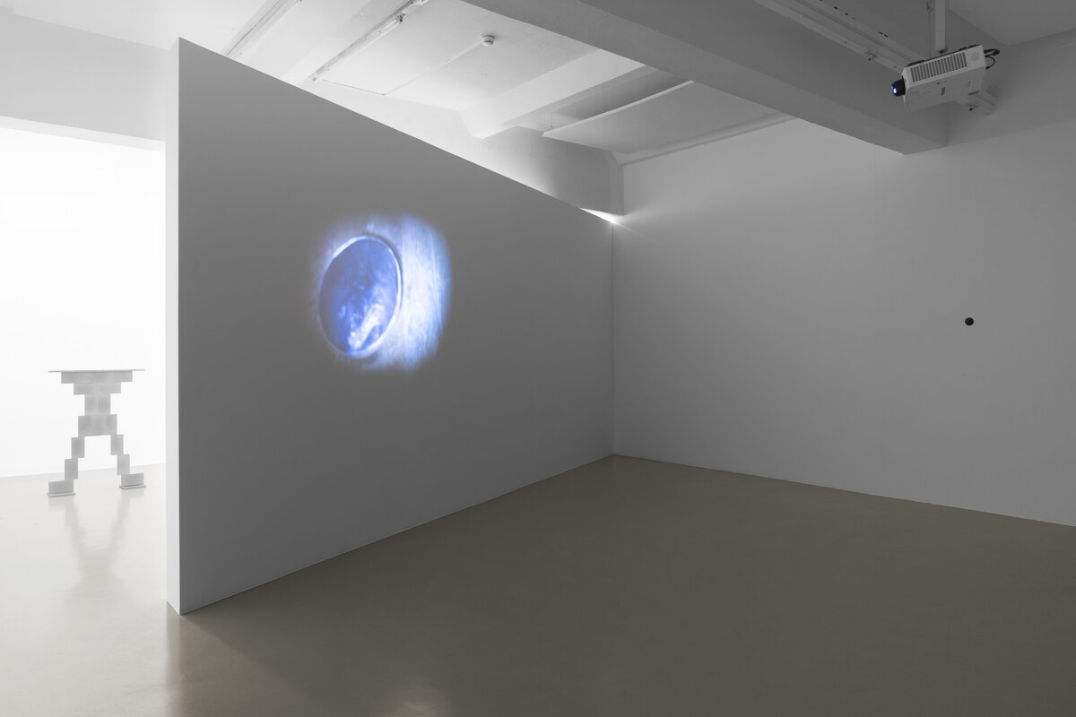 Während der erste Teil der Ausstellung sich an der Dramaturgie einer Bühne orientiert, greift der zweite das Innenleben, also die Handlung auf. Die Skulptur „A“ (2026) im zweiten Teil „The Anecdote“ besteht aus flachen, aneinandergereihten Aluminiumplatten, die übereinander geschichtet eine X-Form bilden. Je nach Standpunkt lässt sich die Skulptur unterschiedlich lesen: als abstrahierte Figur, als Zeichen oder Markierung im Raum. Würde man die Konstruktion auseinandernehmen und die einzelnen Platten direkt aufeinanderlegen, entstünde ein Rechteck.