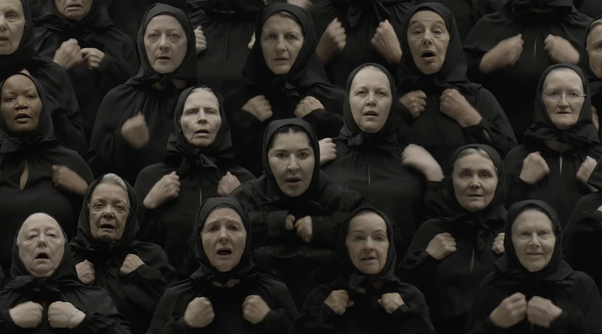 Der Körper ist einer von unzähligen. Eine Luftaufnahme zeigt eine Vielzahl nackte Männer, regelmäßig verteilt auf einer kurz geschorenen Wiese, die Arme angewinkelt, die Becken in verlangsamter, beständiger Bewegung: „Den Boden ficken / Fruchtbarkeitsriten“. So der Titel der vierstündigen Videoarbeit von 2025, Teil des neuesten, der Ausstellung den Namen gebenden Werkzyklus „Balkan Erotic Epic“: Marina Abramović, die Königin der Performancekunst, ist zurück in Berlin.