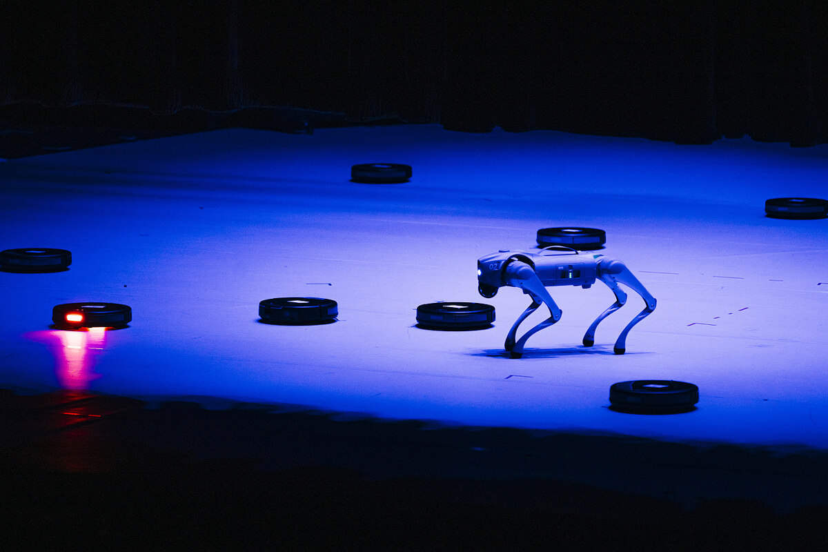 Zum Schluss kommen die Saugroboter. Von links fahren sie weiß leuchtend auf die abgedunkelte Bühne des Hannoverschen Schauspielhauses, auf der die acht Darsteller:innen und ein elektrischer Hund mit seltsam verwinkelten Gliedmaßen liegen, wie abgeschaltete und in der Bewegung erstarrte Elektrogeräte. Immer mehr anthrazitfarbene Hartplastikscheiben gleiten rein. Ganz vorne, die muss Fortinbras sein.