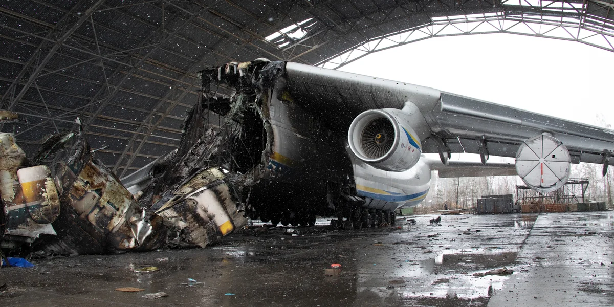 Dieses Flugzeug war immer der ganze Stolz der Ukraine, weil ukrainische Konstrukteure es entworfen hatten. Jetzt ist nichts von ihm übrig geblieben und es kann auch nicht wieder instand gesetzt werden.