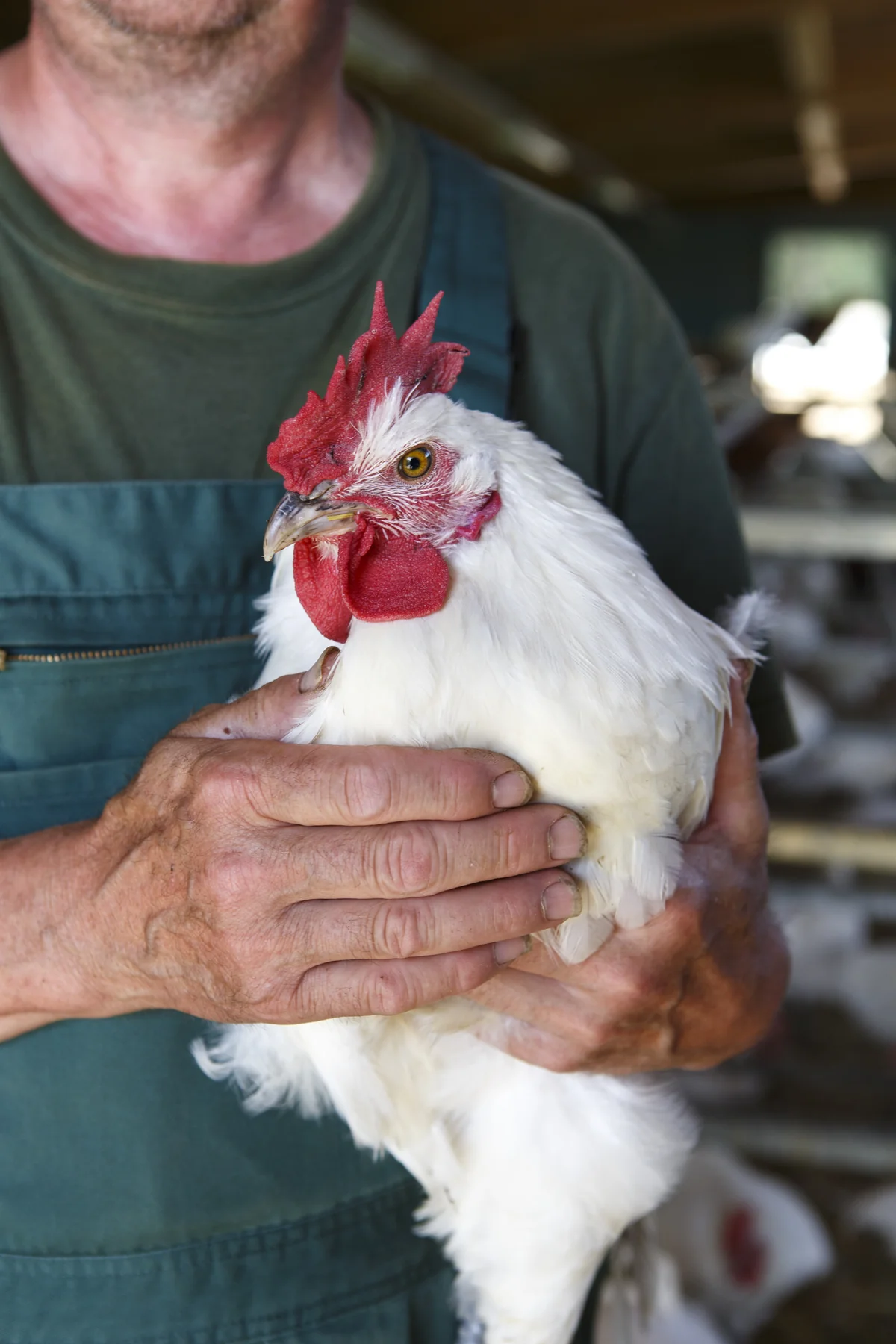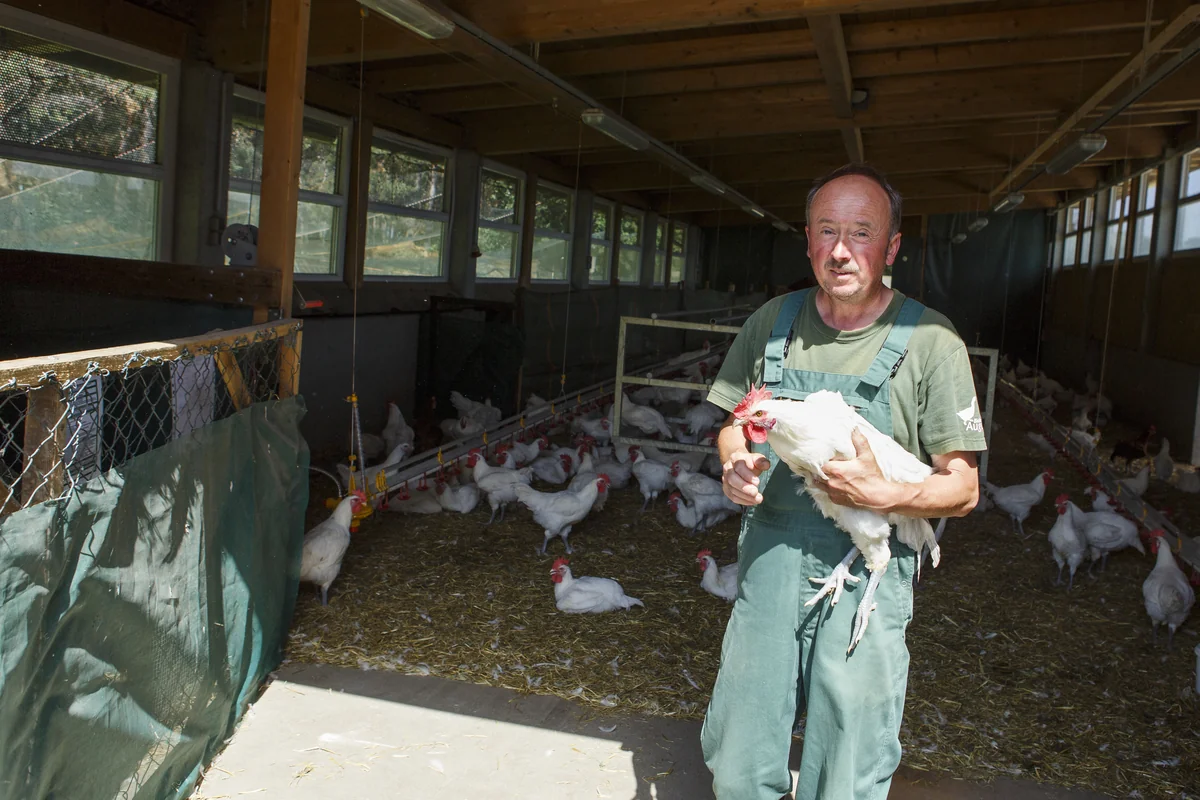 1.000 Hühner leben in Maczkowskis Stall, der Boden ist mit Stroh eingestreut, ein kleiner Aufbau aus Eisen dient den Hühnern als Sitzstange. Es riecht nach Tier, nach Land. Die Hühner, die hier scharren und nach Körnern picken, sind Bressehühner. Große, kräftige Tiere mit feuerrotem Kamm. Eine alte Rasse, ursprünglich aus Frankreich, es sind sogenannte Zweinutzungshühner.