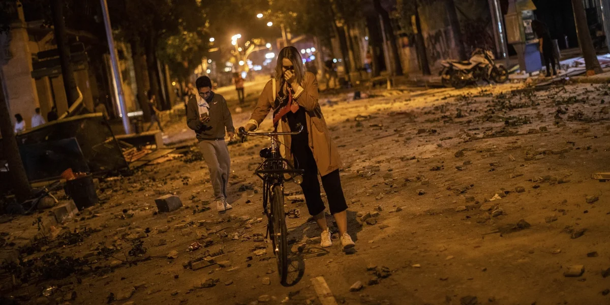 So auch an diesem Freitag: Nicht weit entfernt von den Tanzenden, vor dem abgesperrten Kommissariat der spanischen Nationalpolizei, bietet sich ein anderes Bild. Junge Menschen beleidigen die Beamten, werfen Gegenstände. Die Polizisten rücken daraufhin aus, setzen Schlagstöcke, Gummigeschosse und erstmals ihren einzigen Wasserwerfer ein. Das Gerät war in den achtziger Jahren angeschafft und seither nicht benutzt worden.