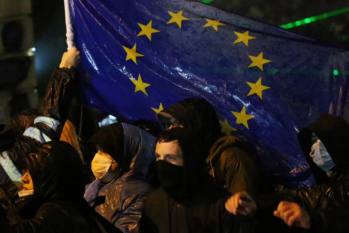 Anfang dieser Woche, ein kalter Dezemberabend in Tbilissi, etwa zehn Teenager mit Steinen in der Hand stehen vor dem Parlamentsgebäude und schlagen rhythmisch und energisch gegen eine große eiserne Wand, die das Gebäude schützt. Ihr lärmender Protest ist so etwas wie der Soundtrack für die wütenden Proteste. Zwei der Jungen tragen die georgische Flagge, einer die EU-Fahne, ein weiterer hält beide zusammen – alle haben schwarze Masken auf. Sie ziehen es vor, unerkannt zu bleiben. Denn mit Hilfe der Videoüberwachung am Parlamentsgebäude kann die Polizei leicht Personen identifizieren, die einen „Sturm auf das Parlament“ versuchen oder „den Betrieb eines staatlichen strategischen Objekts stören“, wie es im Amtssprech heißt. Beides könnte mehrere Jahre Gefängnis bedeuten.
