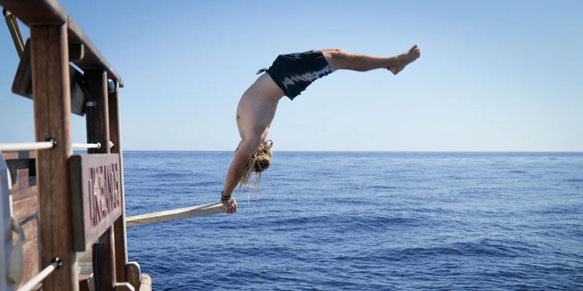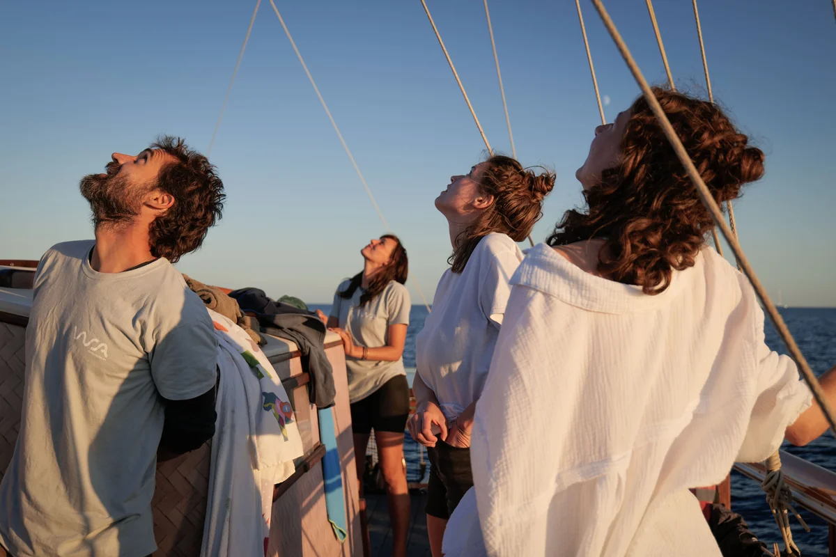 Unser Katamaran ist polynesischer Bauart. Okeanos-Stifter Dieter Paulmann und sein Team haben ihn aus der Südsee ins Mittelmeer überführen lassen, um hier mit jungen Erwachsenen vorwiegend „Ocean Camps“ auszurichten. Dabei geht es um Umweltbewusstsein, Meeresschutz und viel Wissenswertes rund um Ozeane, Artenvielfalt und Klimawandel. Eine dreiköpfige Crew, erfahrene Segler:innen und Meeresbiolog:innen, begleiten die Gruppen – so auch bei uns, dem ersten journalistischen Team an Bord.