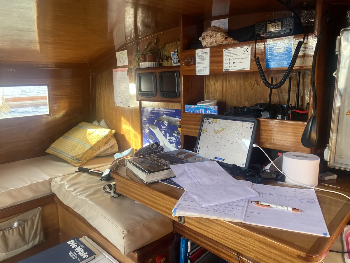 Ins Führerhaus der Vaka zogen wir uns bei Sturm zurück. Hier ging der Funk ein, plante Kapitän Jorge die Route, fanden Besprechungen statt oder Seekranke ein Bett, um sich zu erholen. Denn wir hatten raue Bedingungen Mitte September vor der französischen Küste. Von hier aus lauschten wir auch mit dem Hydrophon den Gesängen der Pottwale, die wir einmal auch aus der Ferne sahen.