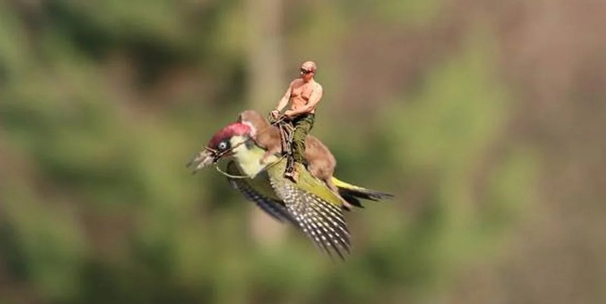 Ein Bild des russischen Präsidenten Wladimir Putin, der mit nacktem Oberkörper auf einem Wiesel reitet, der auf dem Rücken eines fliegenden Spechts hängt. Eine von Tausenden Varianten von dem Wieselspecht, die kürzlich durchs Netz spülten – eingebettet zwischen Bildern von „Sad Keanu“ Reeves und erstaunt dreinblickenden Eulen, unterschrieben mit Sprüchen in fetten weißen Lettern. Alberner Internethumor. Internet-Meme.