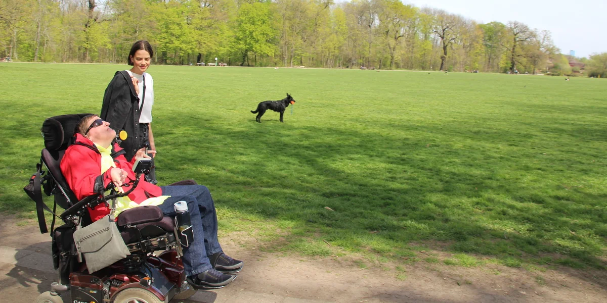 Anette Winkler hat sich heute dazu entschieden, mit ihrer Assistentin einen Spaziergang im nahe gelegenen Park zu machen. Die Sonne scheint, in der Ferne sieht man ein paar Tiere im Zoo in der Nähe. Für Winkler ist es eine wichtige Freiheit, nicht mehr in einem Wohnheim zu leben. Vor allem in der Coronakrise ist sie dankbar über ihre Selbstbestimmtheit, auch wenn sie sich einschränken muss. Sie hofft, dass bald alles vorbei ist, sie ihr Jubiläum vielleicht doch noch feiern kann.