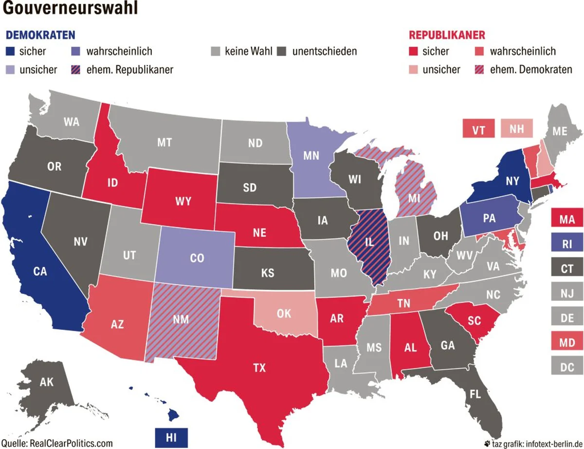 Die meisten Wahlanalysten gehen davon aus, dass die Demokraten eine Mehrheit im Repräsentantenhaus erringen können, der Senat aber in republikanischer Hand bleibt oder die Republikaner ihre Mehrheit dort sogar ausbauen können. Bei den Gouverneuren rechnen sich die Demokraten gute Chancen aus, den Republikanern bis zu 8 Posten abjagen und damit künftig in 24 Bundesstaaten regieren zu können. (pkt)