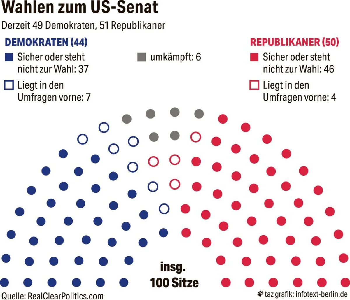 Im Senat müssten die Demokraten eigentlich nur zwei Sitze hinzugewinnen – es ist ein besonders unglücklicher Zufall, dass in diesem Jahr aufgrund des Sechs-Jahres-Turnus sehr viel mehr Demokraten um ihre Wiederwahl kämpfen müssen als Republikaner. So prognostizieren die meisten Wahlforscher eher das Gegenteil: einen leichten Ausbau der republikanischen Mehrheit.