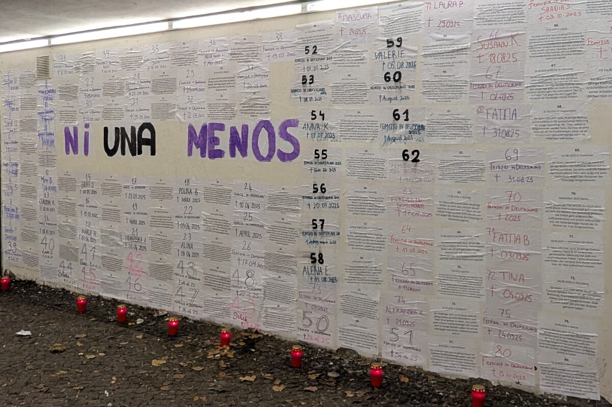 Bei Einbruch der Dunkelheit ziehen die Kollektivmitglieder durch die Straßen. In ihren Taschen haben sie Pinsel und Plakate, dazu Eimer voller Klebstoff. Sie halten vor einer Mauer an der U-Bahn-Station Eberswalder Straße und bekleben sie mit weißen Blättern: „Ni una menos“ (Nicht einige weniger) steht darauf in schwarzen und violetten Buchstaben. Um den Slogan aus der argentinischen Feminismusbewegung herum kleben sie die Namen der Frauen, die in Berlin zuletzt Opfer von Femiziden geworden sind. Am Fuß der Wand stehen rote Kerzen aufgereiht.