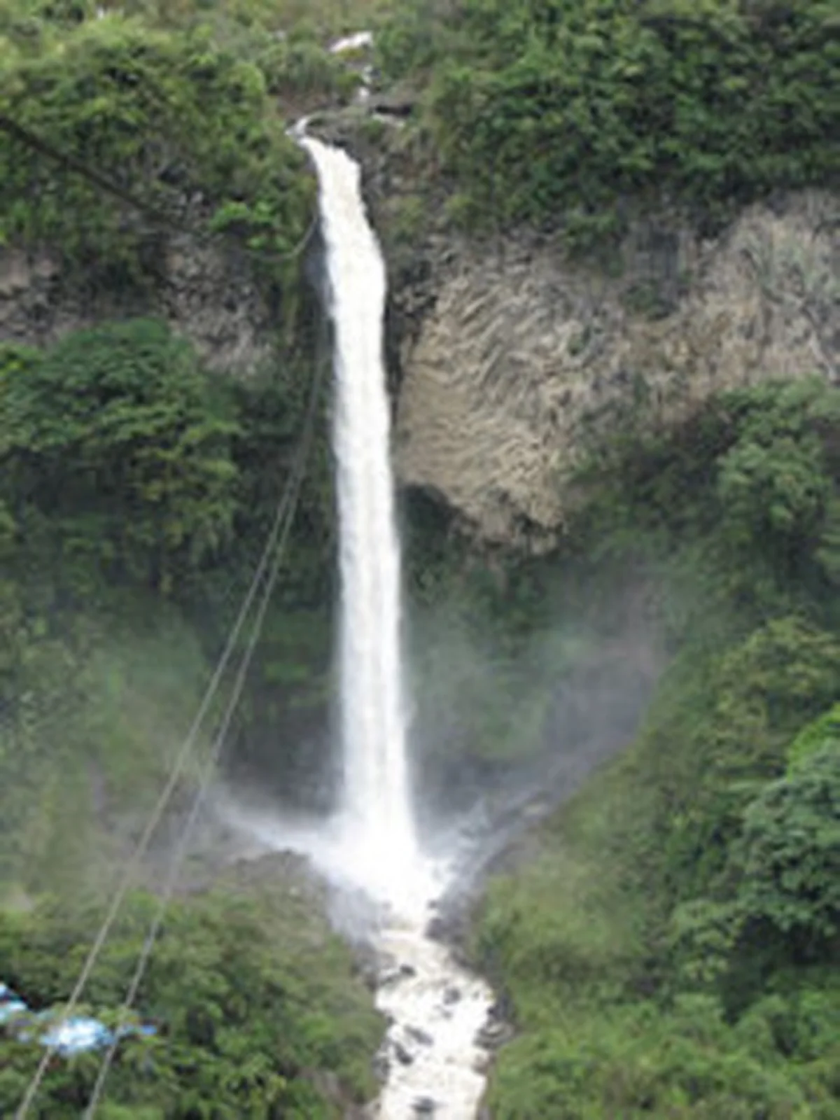 Der Rio Pastaza rauscht weiter durch die schroffe, märchenhafte Schlucht, an der Baños liegt. Riesige Hängebrücken führen auf die andere Seite. Auf dem Dach eines Busses folgen wir dem Wasserlauf, von Wasserfall zu Wasserfall. Steil hinab, in den Stein gefressen oder kaskadiert sprudelt das Nass. Die Vegetation ist subtropisch, meterhohe Farne stehen am Weg. Mit Seilbahnen oder besser gesagt Drahtkörben an einem Seil überqueren Mutige die Schlucht. Eine der Bahnen stoppt senkrecht über einem Wasserfall. Weiß schäumen die herunterstürzenden Wassermassen. Dann wackelt und schaukelt die Bahn wieder und erreicht doch die andere Seite.