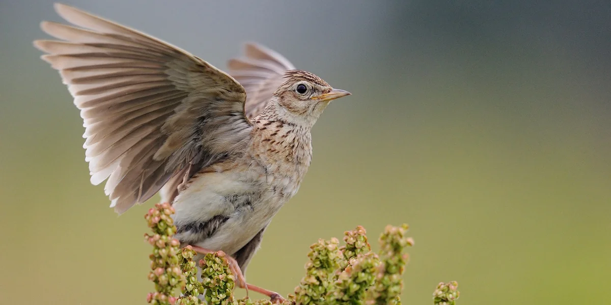 Über die Musik der Heidelerche schrieb übrigens der große Vogelstimmen-Imitator Olivier Messiaen sehr schön: „Aus Himmelshöhen, dem Blick verborgen, spult die Lerche ihre Zwei-und-zwei-Melodien herunter, absteigende Tonfolgen aus lauter fließenden Halbtönen. Verborgen im Gebüsch oder aus Waldlichtungen heraus antwortet ihr die Nachtigall. Kontrast zwischen dem beißenden Tremolo der Nachtigall und jener mysteriösen Stimme aus der Höhe. Unsichtbar kommt die Lerche näher und entfernt sich wieder. Die Bäume und Felder sind schwarz und ruhig. Es ist Mitternacht.“