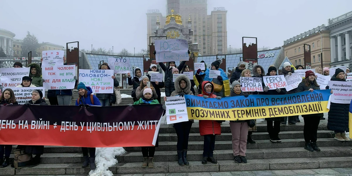 Die Frage der Fairness, die nach einer irgendwie gerechten Verteilung der Schrecken des Krieges in der Ukraine, stellen nicht nur Soldat:innen wie Serhii Hnesdilov. Eine kleine, aber gut organisierte Bewegung von Frauen demonstriert dafür, dass ihre Männer, Brüder, Söhne möglichst bald die Armee verlassen dürfen. Am 28. Januar und am 11. Februar versammeln sich jeweils mehr als 100 Frauen auf dem zentralen Platz in Kyjiw, dem Maidan, sie rufen: „Helden sind keine Sklaven!“, und: „Das ganze Land ist für den Sieg verantwortlich!“ Es ist ihre sechste und siebte Demonstration, sie protestieren seit dem Herbst.