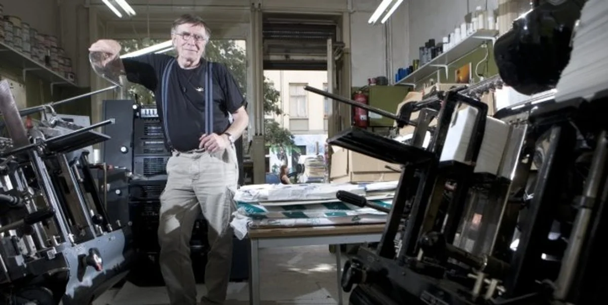 Klaus Regel, geboren 1937 in Steglitz und aufgewachsen in Friedrichshain, ist gelernter Buch- und Offsetdrucker. Er arbeitete 40 Jahre im Druckkombinat Ostberlin. 1992 machte er sich mit 55 Jahren zum ersten Mal in seinem Leben selbstständig - mit einer alten Druckwerkstatt in der Samariterstraße in Friedrichshain. Hier bietet er an: Buchdruck, Offsetdruck, Heißprägung, Reliefdruck, Holografie, Beratung, Entwurf, Satz, Fremdsprachensatz.