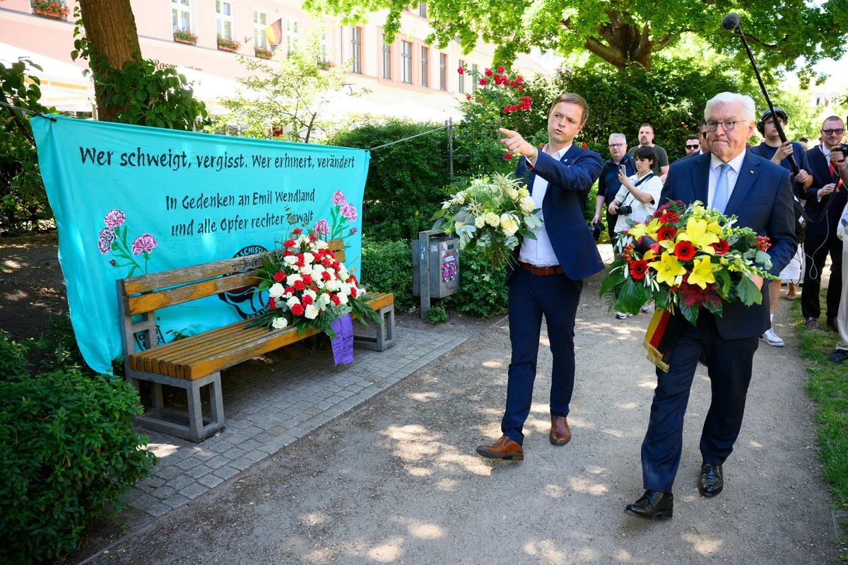 Neben der Gedenkstele im Rosengarten liegt heute auch ein Kranz des Bundespräsidenten. Tatsächlich war hier nur wenige Stunden vor der Gedenkveranstaltung Frank-Walter Steinmeier mit dem Neuruppiner Bürgermeister Nico Ruhle (SPD) aufgetaucht, um an Wendland zu erinnern.