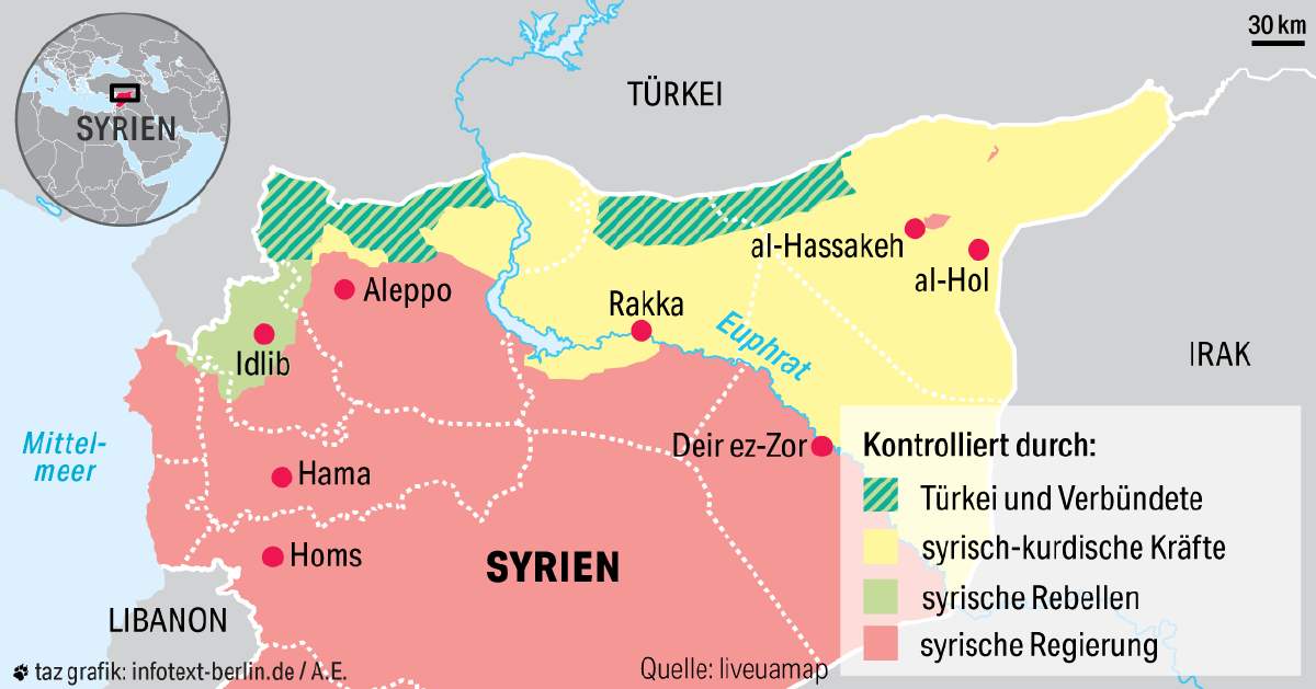 Die syrischen Kurd*innen streben nach Autonomie. Die Türkei sieht in ihrem militärischen Arm eine Terrororganisation. Präsident Recep Tayyip Erdoğan möchte einen Kurdenstaat an der türkischen Südgrenze verhindern. Daher startete er zwischen 2017 und 2019 mehrere Militäroffensiven und vertrieb die kurdischen Kräfte aus den grenznahen Gebieten.
