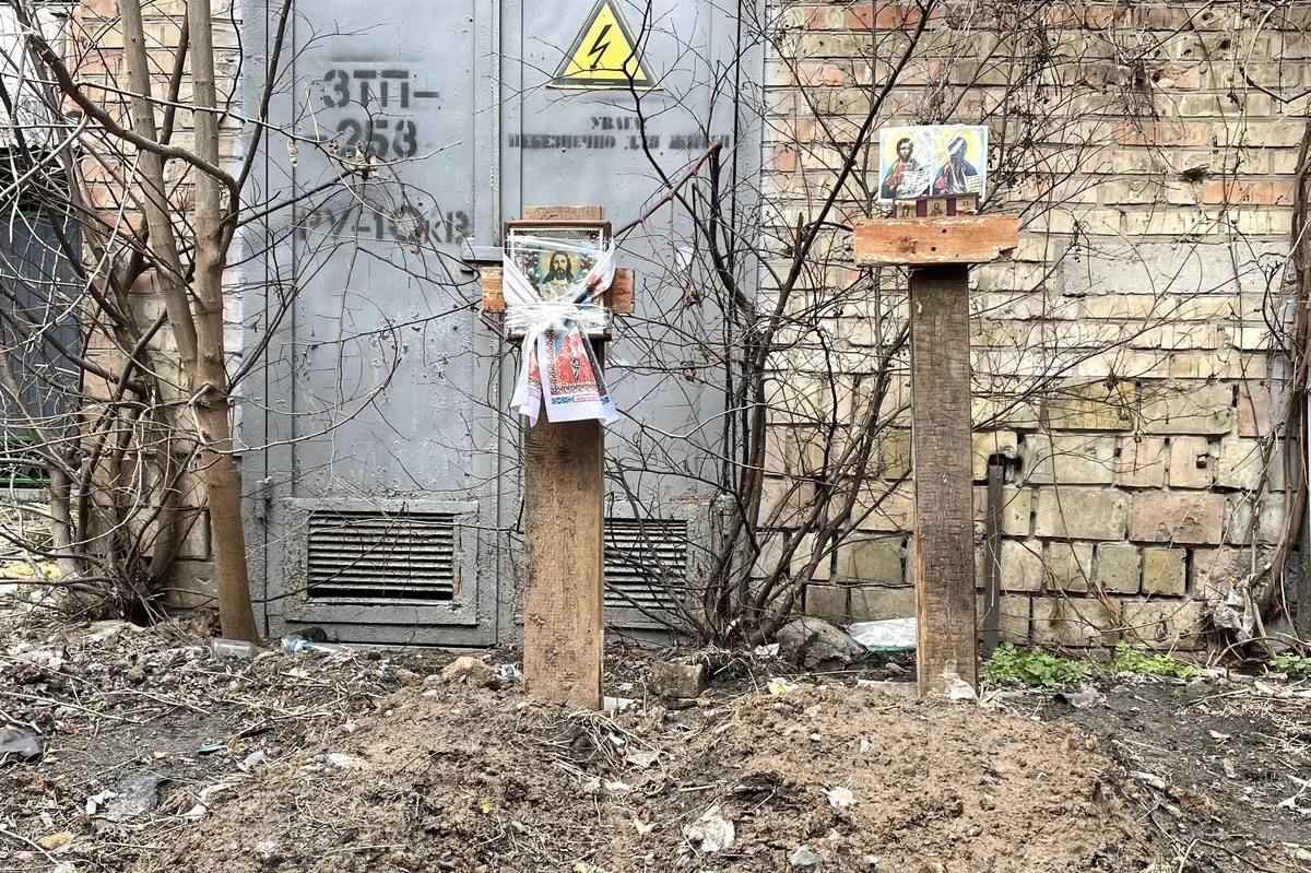 Dann, so erzählt sie weiter, seien plötzlich russische Soldaten gekommen, nicht älter als 25 Jahre. „Hinter dem Haus sind drei Gräber. Wir haben dort die Nachbarn begraben, die sie umgebracht haben“, berichtet Evgeni. Er geht mit nach hinten, um die Stelle zu zeigen. Zwei Gräber liegen direkt nebeneinander, das dritte ein bisschen entfernt. Die Nachbarn haben Stöcke auf die frischen Grabhügel gesteckt und versucht, ein Kreuz mit einer orthodoxen Ikone zu errichten. Es fällt Irina schwer zu erzählen, was passiert ist, und Evgeni, der ihr schweigend zu hört, laufen wieder die Tränen und seine Hände beginnen zu zittern.