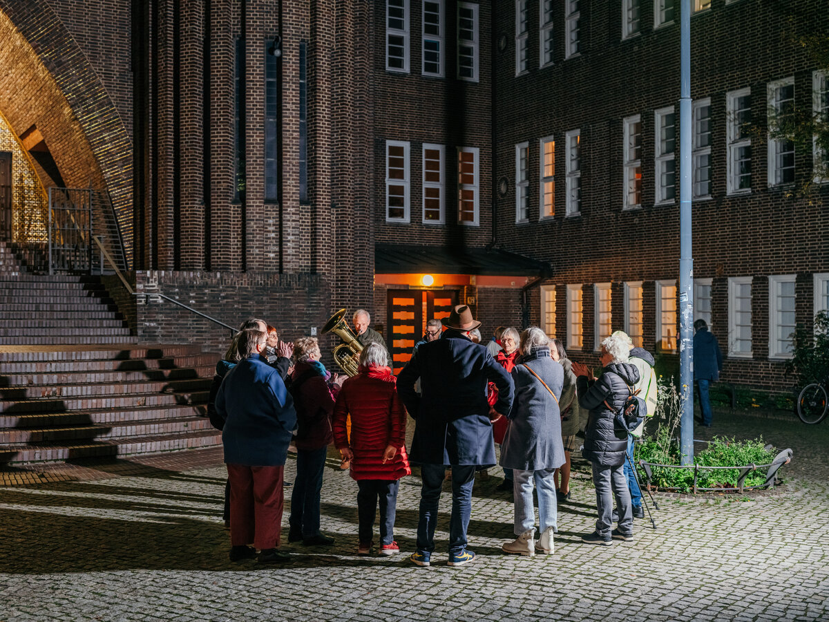 Ein paar Minuten später, vor der Kirche: Jörg Geerdts ist nicht da, alle anderen gleichen ihre Uhren miteinander ab. „Wenn Jörg nicht da ist, brauchen wir es ja vielleicht nicht so genau nehmen“, sagt Ralf Röben mit der Tuba. Gelächter.