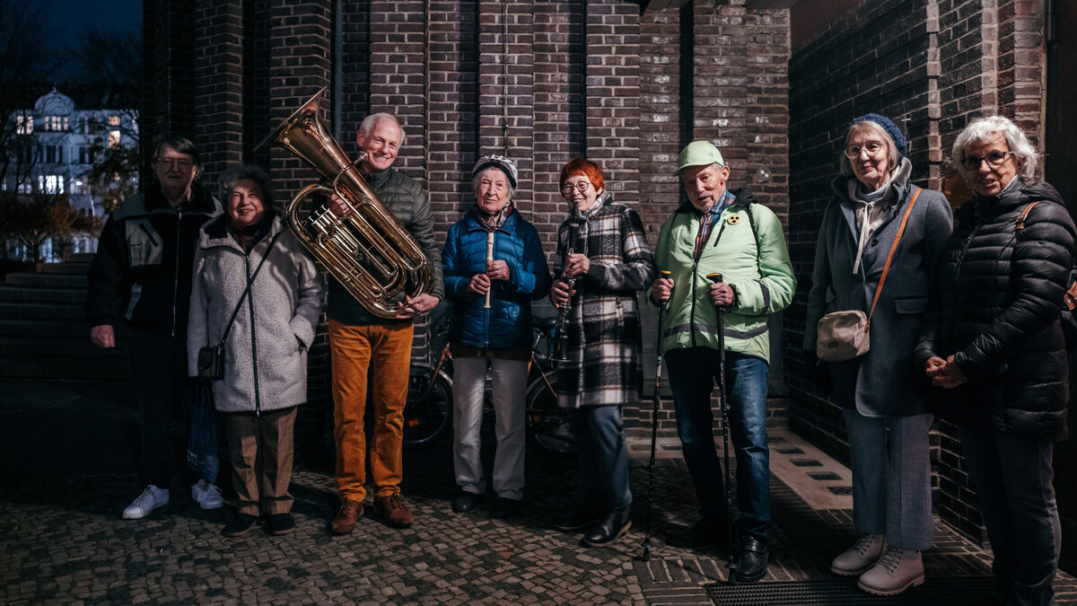 Bevor der Mond aufgehen kann, muss Jörg Geerdts an diesem Mittwochabend im Juni aber noch kurz den blühenden Goldregen fotografieren. Er fummelt sein Handy aus der Jackentasche, was gar nicht so einfach ist, weil der 89-Jährige in beiden Händen einen Walkingstock hält. Wie jedes Jahr im Frühsommer leuchtet das Gewächs auf einem der Balkone neben der Kirche spektakulär. Während Jörg Geerdts fotografiert, baut Heidi Krickeberg ihre Flöte zusammen, Josef Ober unterhält sich mit Ingrid Lippert, Klaus Horlitz stellt sein Fahrrad ab, Dagmar Eichler-Röben und ihr Mann Ralf kommen mit Klarinette und Tuba um die Ecke, Erika Kube begrüßt Erika Pfaffenberg.