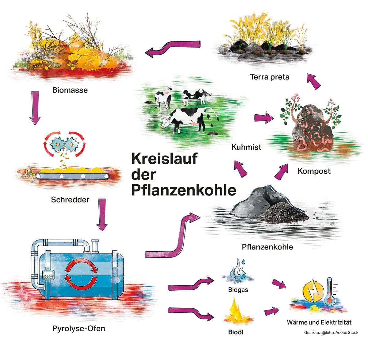 Trotzdem kommt Pflanzenkohle in der hiesigen Landwirtschaft noch kaum zum Einsatz. Sie ist zu teuer. Es sei denn, man nutzt sie in der Kaskade, so wie Sepp Braun aus Freising bei München. Der Biolandwirt erntet Holz auf seinem Ackerbaumstreifen und befeuert mit den Holzhackschnitzeln eine Pyrolyseanlage, die sein Haus heizt und Pflanzenkohle herstellt. Diese verfüttert er an seine Milchkühe, weil das nachweislich die Tiergesundheit verbessert. Die Kühe übernehmen im Stall netterweise die Fermentation, indem sie auf ihren Fladen herumtrampeln. Das Ganze wird kompostiert und kommt nach einigen Monaten auf die Äcker. Auf Brauns 54 Hektar tummeln sich hochgerechnet 25 Millionen Regenwürmer, der Humusgehalt ist auf rund 5 Prozent gestiegen.