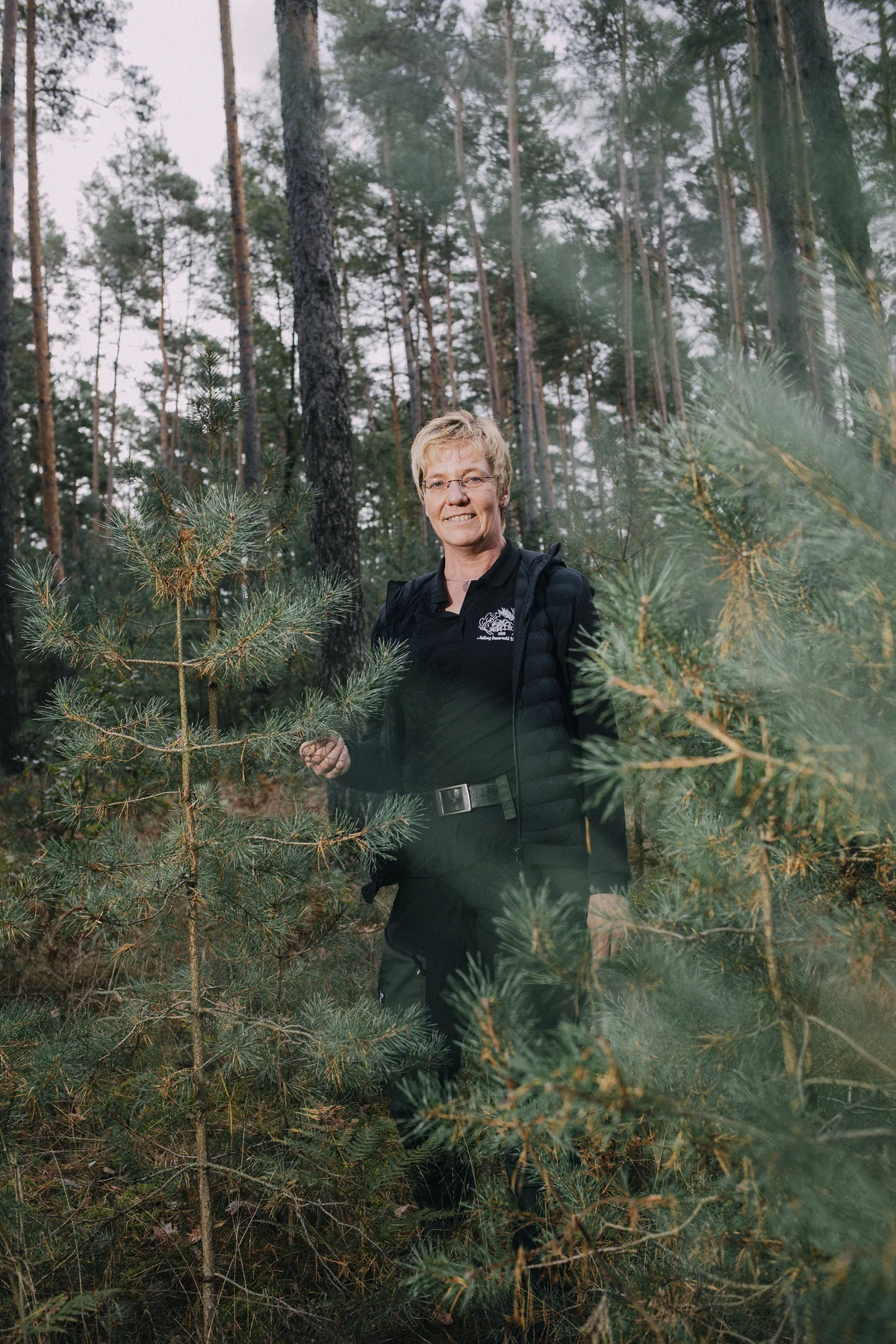 Sie deutet auf eine lichte Stelle. „Da war ein Einschlag, da wurde Licht in den Bestand gebracht.“ Doreen Einhenkel, eine schlanke, sportliche Frau mit kurzem Haar, scheint hier zu wohnen. „Hier haben wir überall Naturverjüngung, nichts ist gepflanzt.“ Sie deutet auf die Bäumchen, zentimeterklein, die aus dem Sand ragen, „die wachsen von allein und so soll es auch sein“.