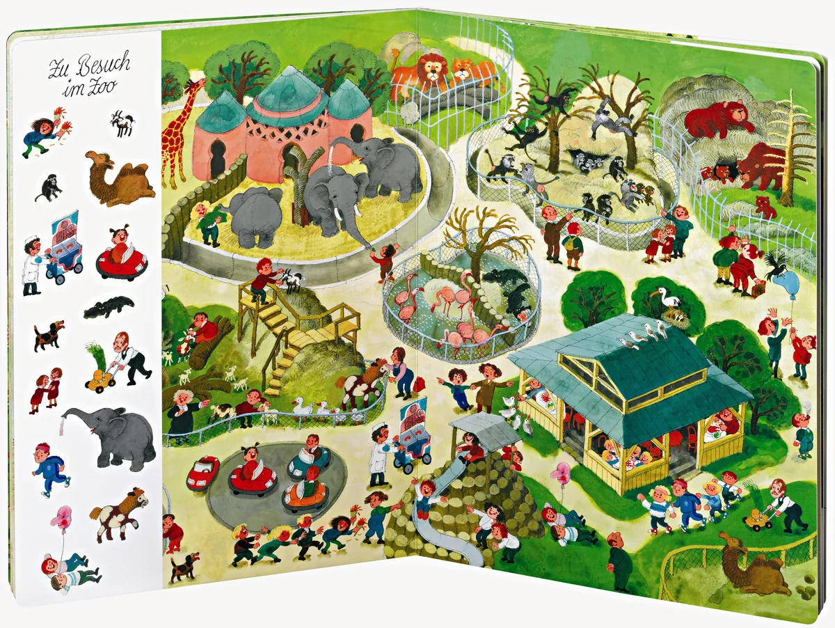 Bekannt wurde der Münchner Illustrator und Maler Ali (Alfons) Mitgutsch 1968 mit seinem Bilderbuch „Rundherum in meiner Stadt“. Auf großformatigen bunten Doppelseiten führte uns der Kinderbuchautor zu faszinierenden öffentlichen Orten des Alltags – zu einer Baustelle, in den Park, auf die Kirmes, ins Freibad oder zum Hafen.