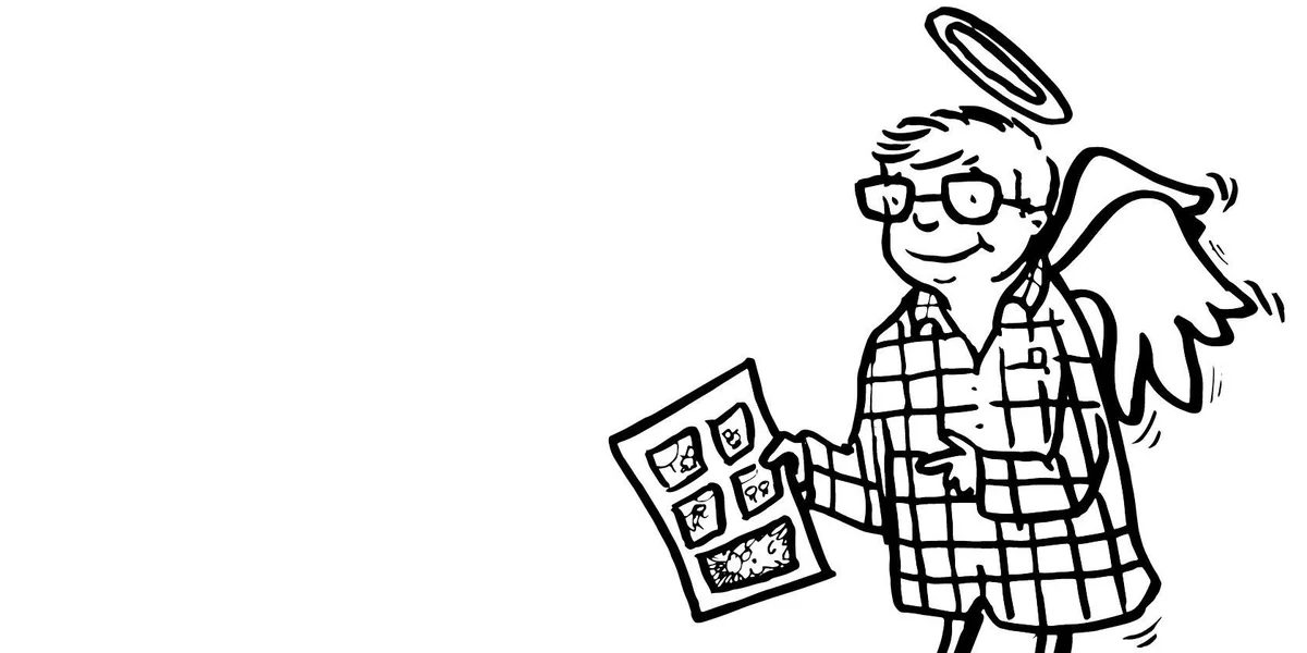 Manches lässt sich mit Bildern einfach besser sagen als mit Text. Vor allem traurige Sachen. Rautie, einer der produktivsten und bekanntesten Künstler der Independent-Comicszene hat Bert Dahlmann gezeichnet, und zwar mit Heiligenschein und auf einer Wolke, und statt einer Harfe oder einer Lyra, die ein Putto zwangsläufig hielte, hat er ihm ein mehrfach kadriertes Blatt in die Hand gedrückt: vier kleinen Quadrate oben, plus – splash! – ein doppelt so großes Panel im Seitenkeller, also richtig mit eigenen Rhythmus und Dramaturgie, so, wie ein guter Strip funktioniert.