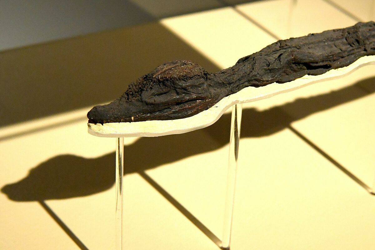 Eine davon liegt in einer Glasvitrine und ist – ein Krokodil. Mumifiziert wurde es im alten Ägypten in dem Glauben, dass ein Gott in ihm steckt. Von einer anderen Mumie ist nur die Mumienhülle ausgestellt, also eine Art Sarg mit einem aufgemalten Gesicht. Null gruselig. Der kleine Junge mit dem Mumieninteresse kommt nicht so recht auf seine Kosten. Vielleicht hat ihm aber auch die Information gereicht, wie die Ägypter die Mumifizierung bewerkstelligten – mit Entnahme der Organe und einem Hirn, das durch die Nase abfließt.