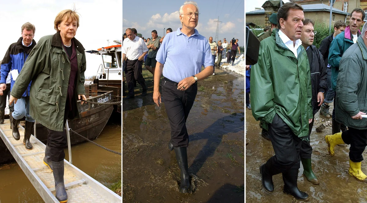 E rstaunlich, aber es scheint ja doch ein Gerhard-Schröder-Erbe zu geben, das unantastbar ist. Jedenfalls wandeln gerade viele in den Fußstapfen seiner Gummistiefel. Für die Nachgeborenen: Es gibt das Gerücht, dass Schröders Auftritt beim Elbe-Hochwasser 2002 ihm die Wahl gerettet hat. Rot-Grün lag damals in den Umfragen hinten, aber der Kanzlerkandidat der Union, Edmund Stoiber, hielt es für vernünftiger, auf Hochwasser-Tourismus zu verzichten. Er überließ Schröder das Feld, der sich an Helmut Schmidt und dessen Hamburger Sturmflut 1962 erinnerte, um umgehend in Gummistiefeln und Regenjacke aufzumarschieren und ein paar ikonische Bilder zu produzieren.