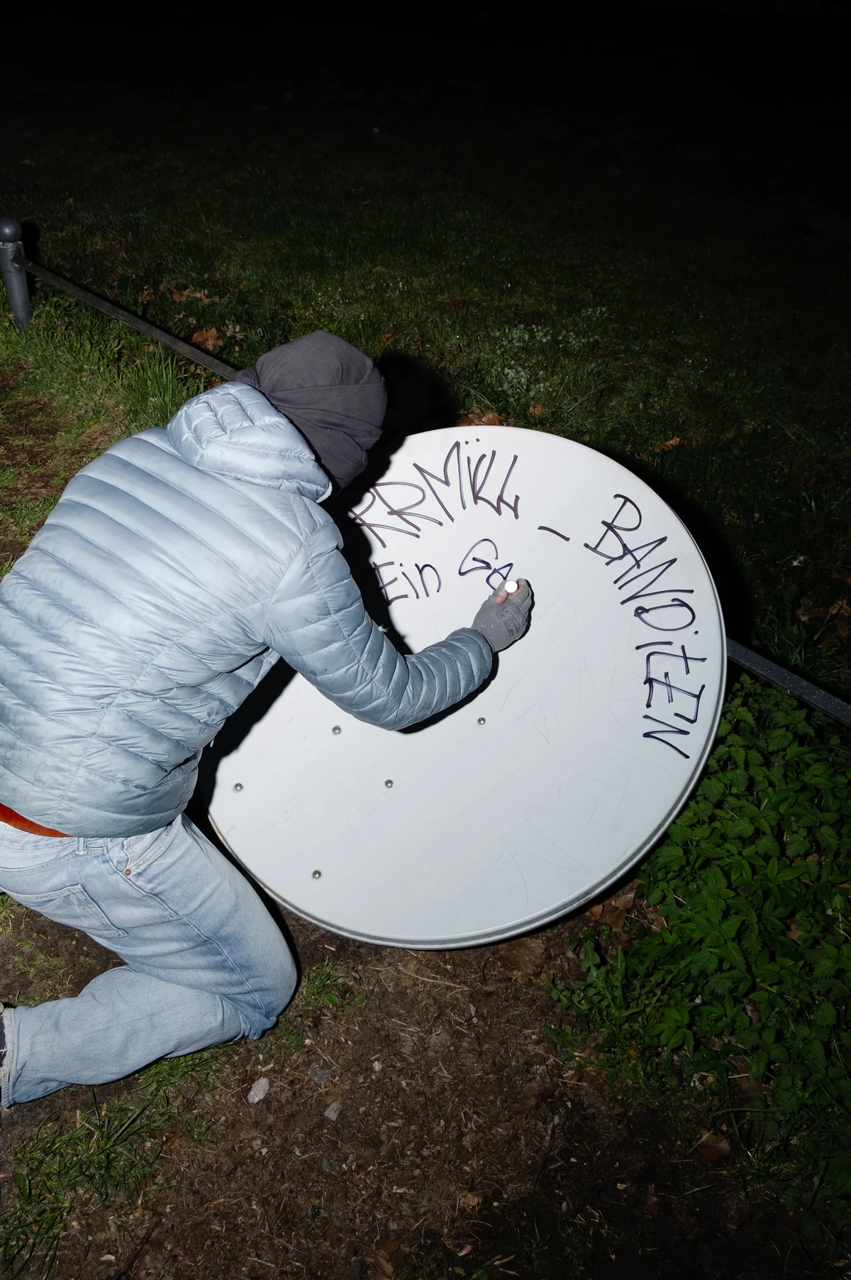 Kurz nach Mitternacht hält der Transporter vor der Uni. Tristan klopft dreimal hart gegen die Seitentür: „Ey Jungs!“ Die Tür fliegt auf, Max rennt mit dem Teppich voran, die anderen wuchten die Sofateile hinterher. Ein Bandit kniet auf dem Boden und taggt auf die Satellitenschüssel: „Ein Geschenk an Studis ♡“. Dann ergänzt er: „MIETEN RUNTER“. Keine fünf Minuten dauert es, dann stehen die Möbel inklusive Schüssel unter dem Triumphtor. Tristan filmt mit dem Handy.