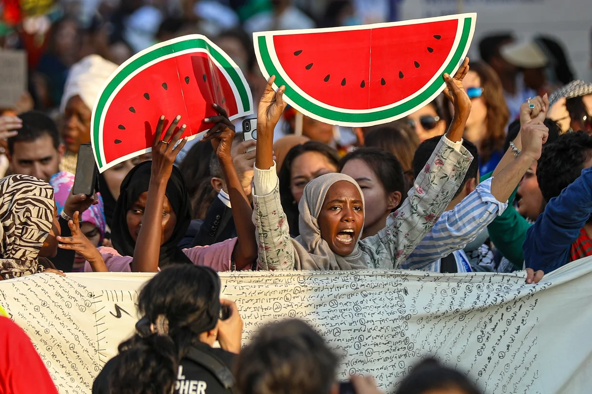 Die Vereinten Nationen haben den Protest auf dem Weltklimagipfel als politisch brisant eingestuft und den Demonstrant*innen scharfe Auflagen gemacht: Verboten sind Palästina-Fahnen und der Slogan „From the river to the sea, palestine will be free“, zu deutsch: „Vom Fluss bis zum Meer wird Palästina frei sein“. Der Spruch ist in Deutschland seit November strafbar, weil er nach Ansicht des Innenministeriums das Existenzrecht Israels infrage stellt und mittlerweile als Symbol der Terrororganisation Hamas gilt. Statt der verbotenen Zeichen haben die Aktivis*innen ausgedruckte Wassermelonen dabei. Es ist eine versteckte Botschaft: Die Farben auf den großen Schildern, die in die Kameras gehalten werden, entsprechen denen der palästinensischen Flagge.