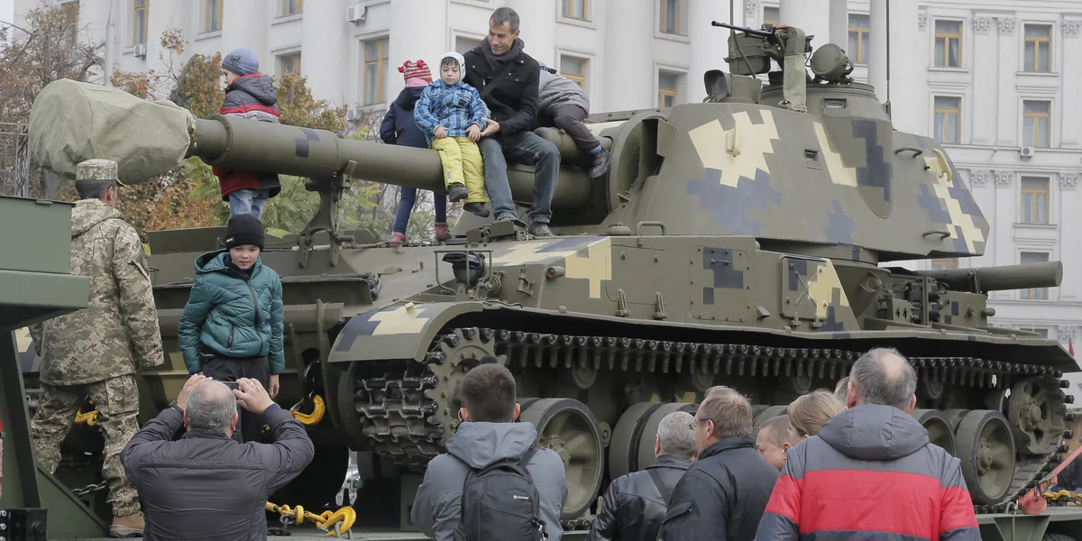 Immer wieder wurden die Redner von Sprechchören wie „Ruhm der Ukraine“, „Die Ukraine über alles!“, „Tod den Feinden!“, „Helden sterben nie“ unterbrochen. Gleichzeitig vergnügten sich Väter mit ihren Kinder auf Panzern, Abschussrampen und anderen militärischem Kriegsgerät. Bereits am Vormittag hatte Präsident Poroschenko die Waffenausstellung auf dem Sophienplatz eröffnet.