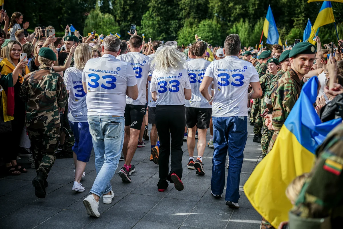 Ein Meer ukrainischer Flaggen und Hunderttausende von Menschen, die ebenfalls in Gelb und Blau gekleidet sind, füllen den zentralen Platz der litauischen Hauptstadt. Auf der Bühne prangt ein riesiges Banner mit der Aufschrift #ukrainenato33: Nach dem türkischen grünen Licht für die Aufnahme Schwedens am Montagabend wäre die Ukraine das 33. Nato-Mitglied. Selenski wird in wenigen Momenten zu den Litauer:innen sprechen. Gerade angekommen in Vilnius, ist dies sein erster öffentlicher Auftritt. Mit den Nato-Verbündeten wird er erst am Folgetag sprechen. Während internationale Journalist:innen verzweifelt seit Tagen schreiben, dass es unklar ist, ob Selenski nach Vilnius zum Nato-Gipfel eintreffen wird, wussten die Vilniuser:innen längst Bescheid. Wie ein Popstar wird Selenski gefeiert, sobald er auf der Bühne mit seiner Ehefrau erscheint. Anschließend spielt eine litauische Band.